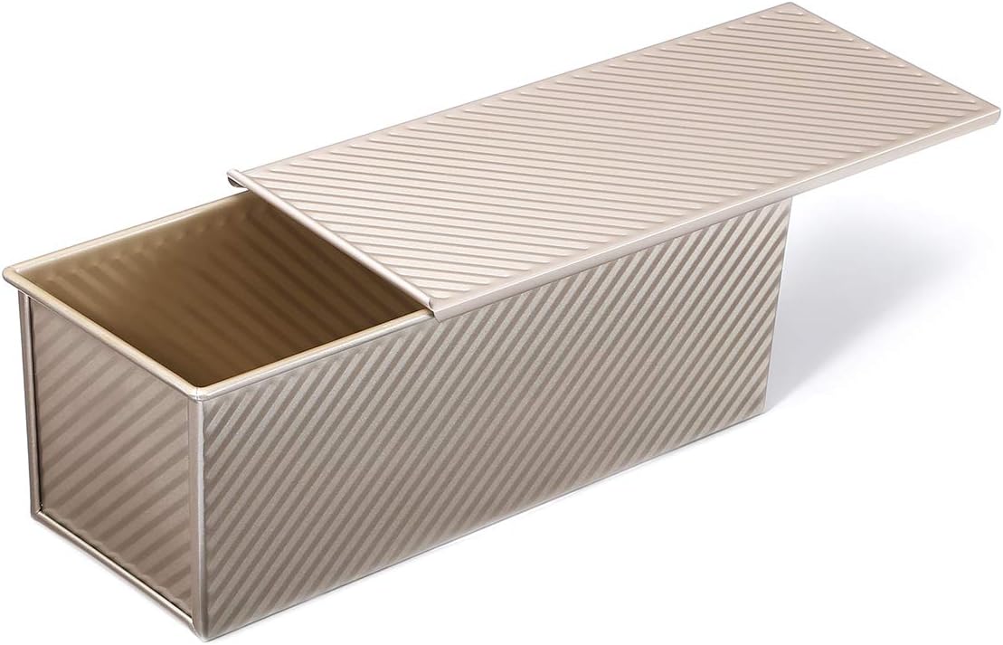 - STYLISH WAY TO BAKE - Complement the overall theme of your kitchen with this elegant 13.5x5.5x4.75 inch pullman pan. It features a nice champagne gold color that will blend naturally with the rest of your bakeware.The big size suits for 4-8 people family.