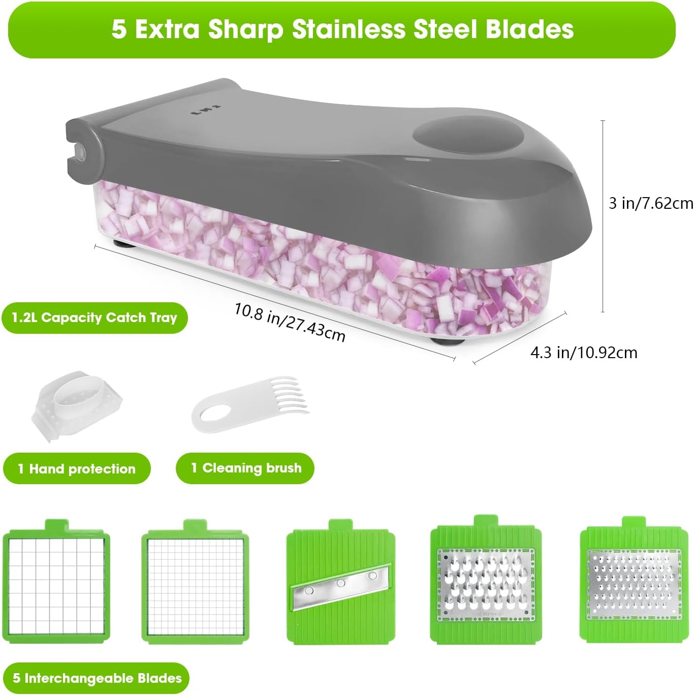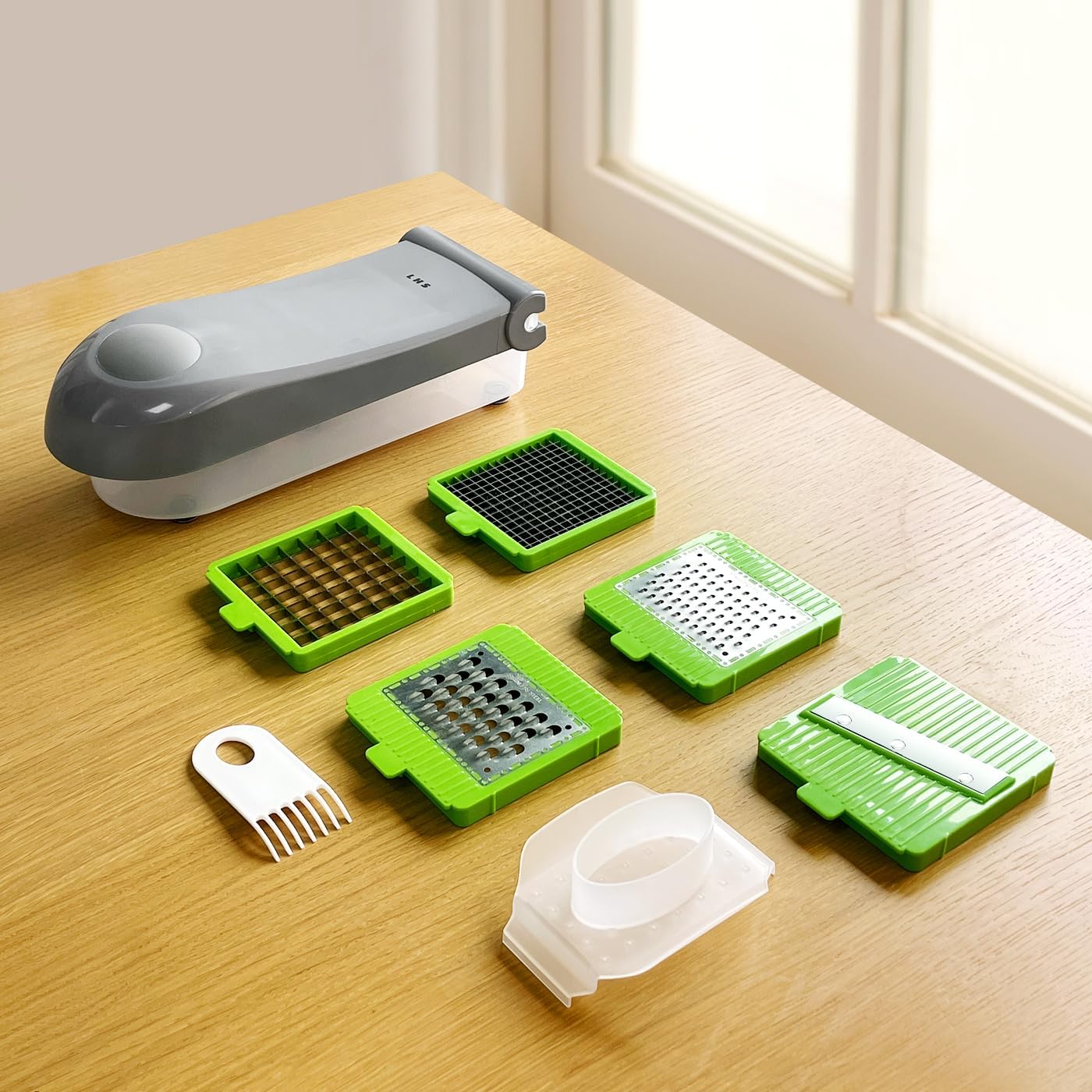LHS Multifunctional Vegetable Chopper - 7 in 1 Veggie Slicer, Dicer, Cutter for Onions, Potatoes, Salad - Grey Container Included