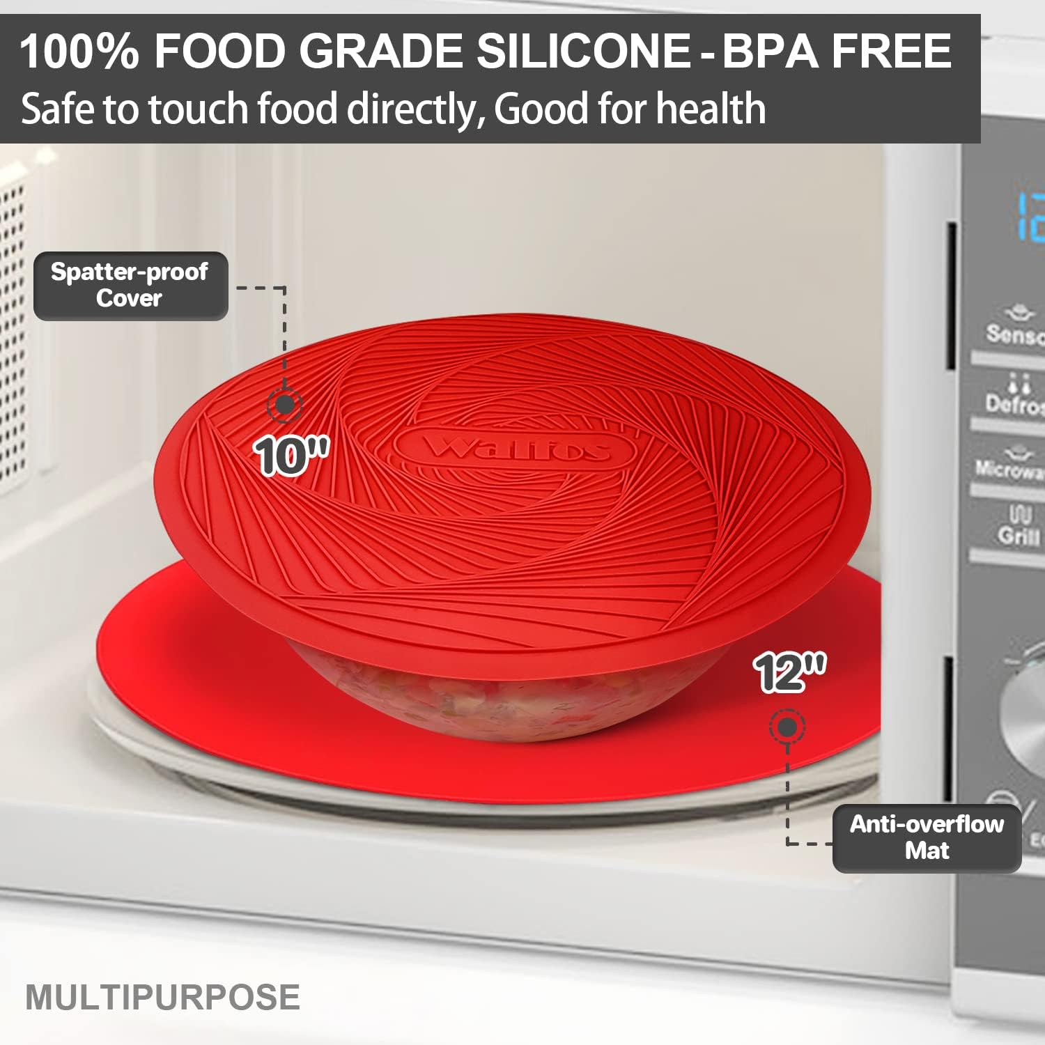 - MULTIPURPOSE SILICONE MAT: Walfos Microwave Silicone Mat is perfect to use as microwave splatter cover, hot pads for kitchen, trivets for hot pots and pans, silicone pot holders, place mat, baking mat, drying mat, utensils rest, jar opener, etc. Package Includes: Two Round Microwave Mats (one 10 inch & one 12 inch)