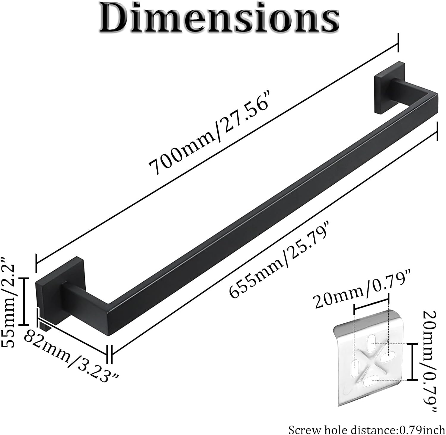 - 【Measure Before Buying】Dimensions 27.56''Lx2.2''Wx3.23''H, Useable Length 25.79 Inch towel hanger. 2.8 Inch Separation Distance from Wall - Enough space for quick drying, hanging towel quickly.No need to fold your towel any more.If you have any questions about the black towel bar, please feel free to contact me at any time