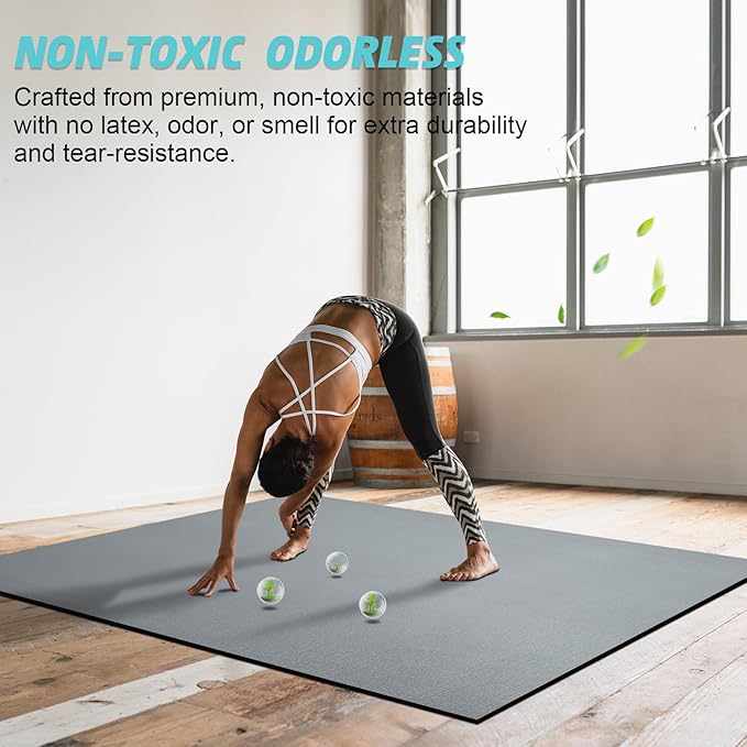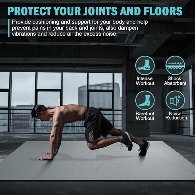 - ✅EXTRA-LARGE HOME GYM MAT COVERS 40 SQUARE FEET: The 8’x5’x7mm large fitness mat instantly transforms any space into a professional gym, giving you and your partners more than enough room to workout on without feeling cramped, and the floor mat is even shoe-friendly, whether you’re doing cardio, yoga, weightlift, dance workout including P90x, MMA, TAM, insanity, T25, Zumba, TRX, kettlebell, jumping rope or need large mats to install underneath a treadmill or weight bench, try this exercise mat.