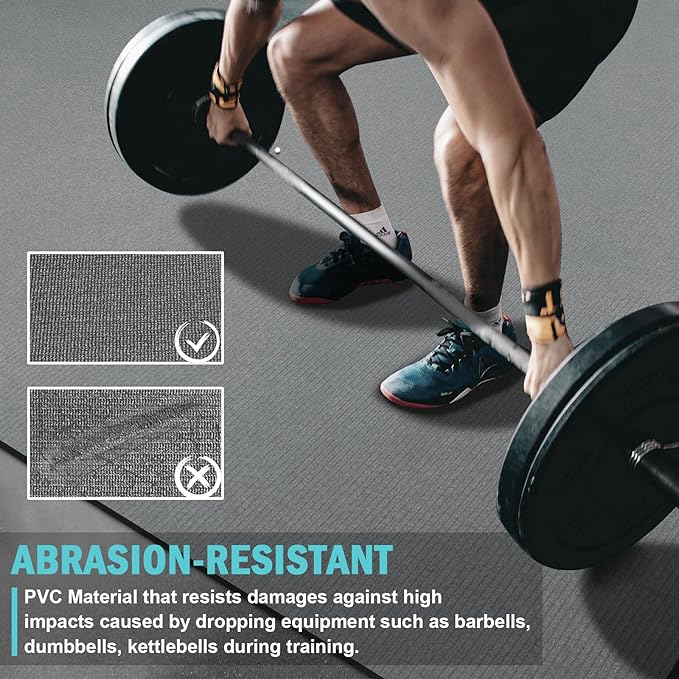 - ✅ UPGRADED ABRASION-RESISTANT NO-SLIP PADDING: Workout mats' top utilizes a smart PVC material, that’s designed to prevent tear and scratch, resisting damages against high impacts caused by dropping equipment such as barbells, dumbbells during training, making exercise mats for home workout easier to wipe up after use. Bottom circle-pattern prevent gym floor mat from sliding around and secure traction, the sports mats create perfect combination of heavy-duty toughness, comfort and stability.