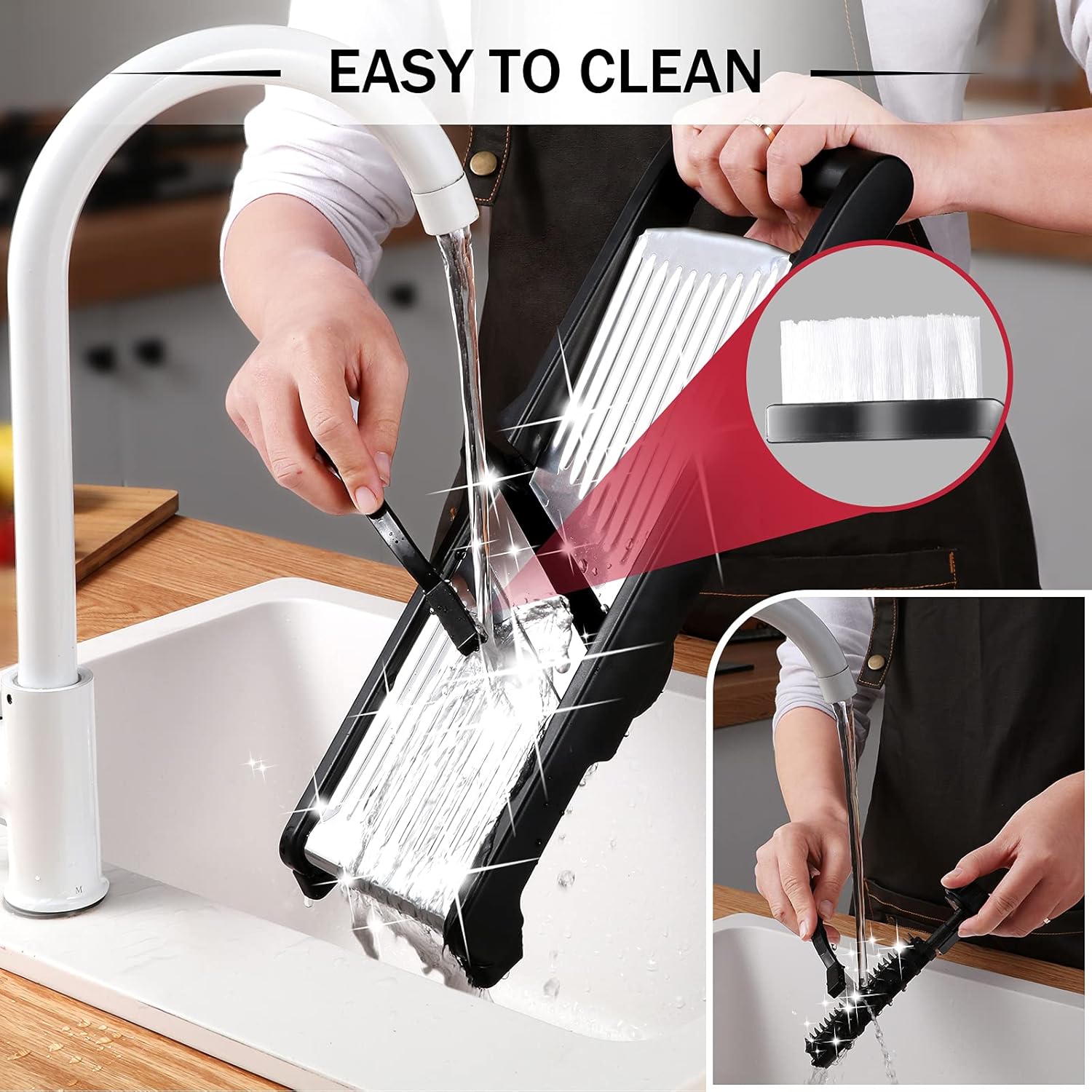 - SAFE AND SECURE: This mandolin comes with three items to keep you safe. Food guard to hold food while cutting, so your hand stays protected from the blade. As a second line of defense we have also provided a cut resistant glove, so your fingers are well protected. Finally, we've provided a cleaning brush, so you don't have to touch the steel blade when washing dishes.