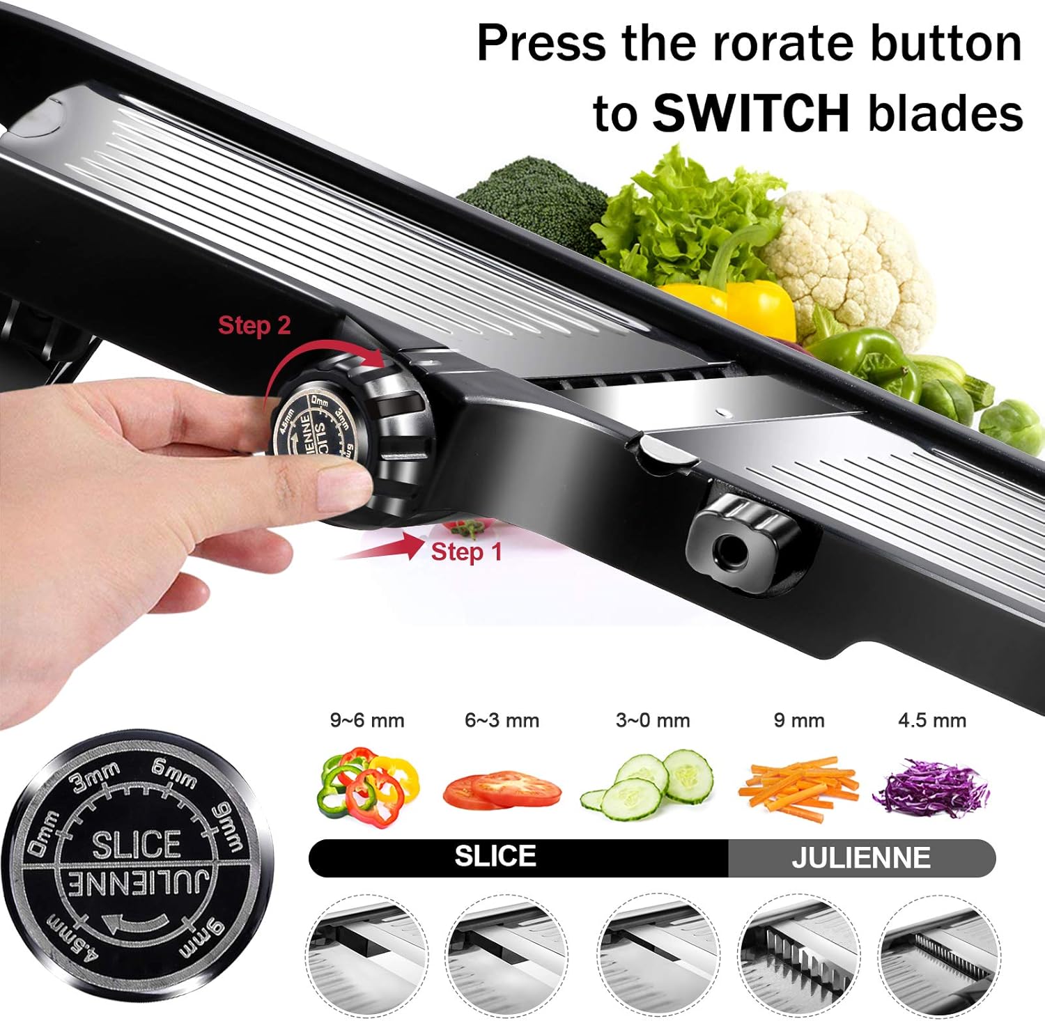 - ADJUSTABLE THICKNESS: This mandoline can adjust the thickness of slices and shreds. Turn the circular knob to adjust the blade, allowing you to get 1mm to 9mm slices, or 4.5mm or 9mm juliennes. Ideal for chips, fries, fruit and vegetable salads for a healthy plant-based meal.