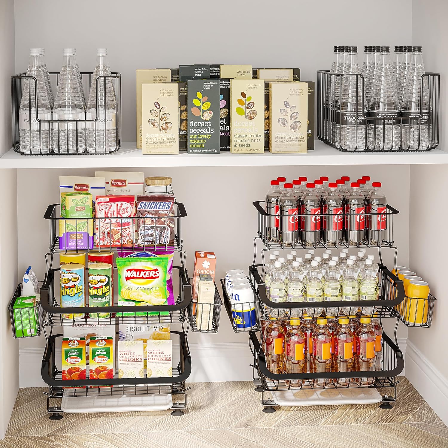 - [3 Tier Metal Wire Baskets with 2 Free Hanging Basket]: Our 3-tier market basket stand is multifunctional and practical. Comes with 2 free baskets, which can be hanged outside the drawer/ cabinet or put them on the countertop directly, convenient to put spices or various bottles.