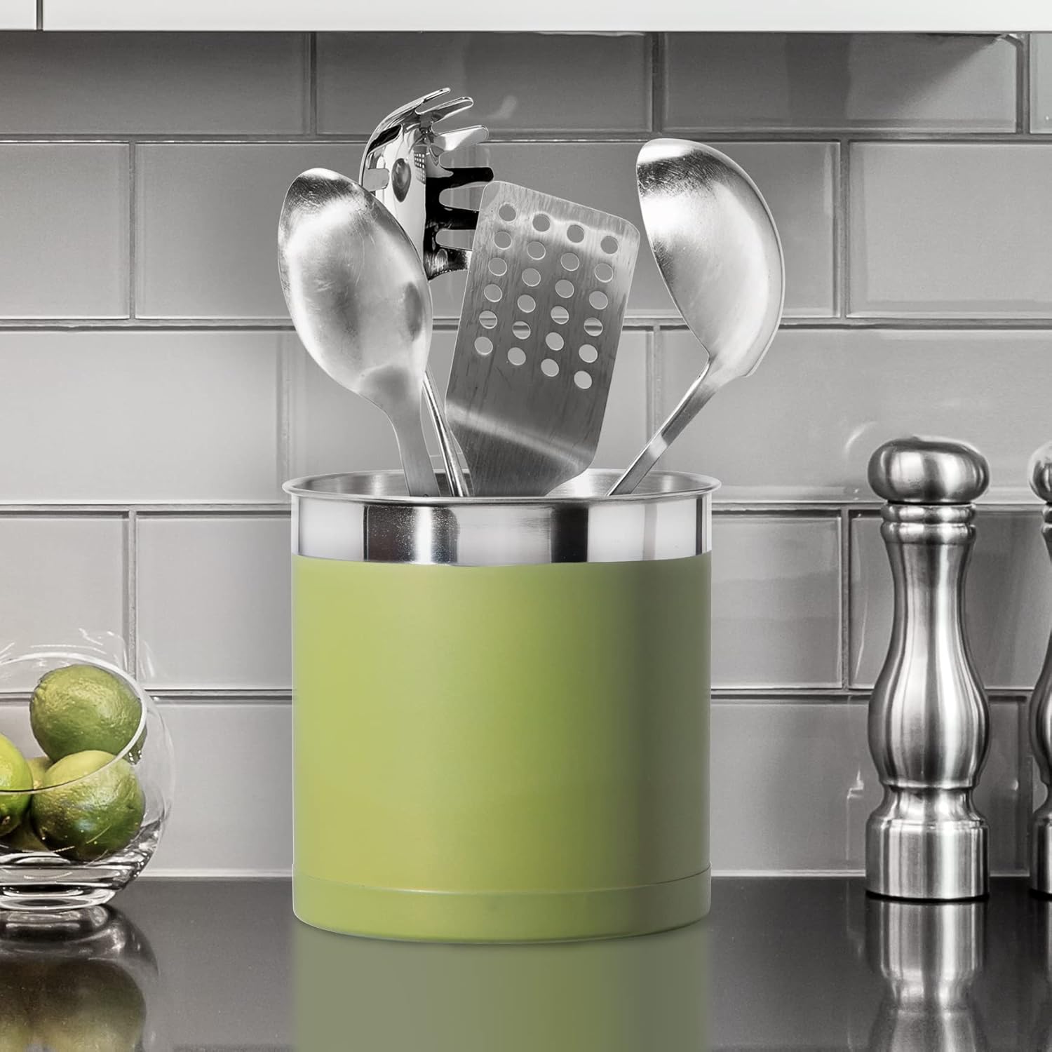 - GREAT VALUE: Utensil holder is 7" in diameter with a height of 6.5". BPA-free, non toxic, chemical and lead-free. The beautiful powder coated color finish is trimmed with a mirror band working well in any kitchen design. Color - Olive.