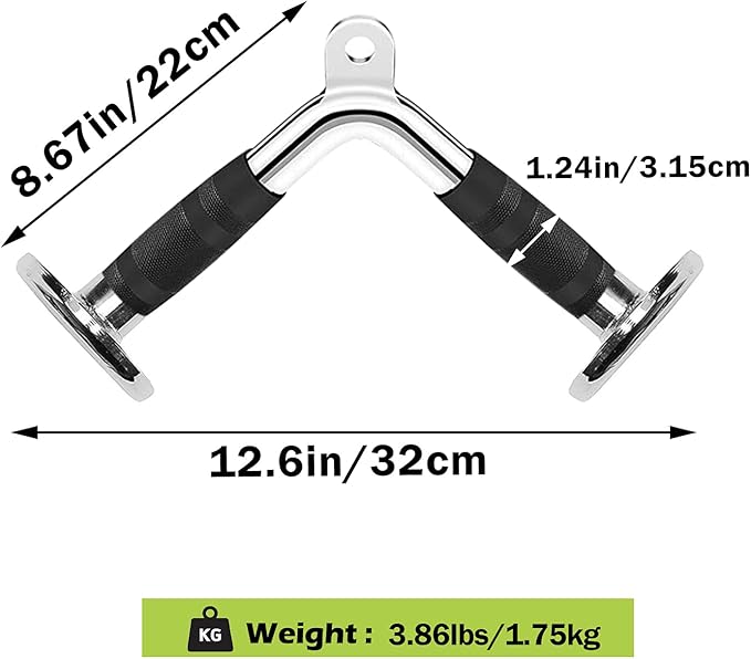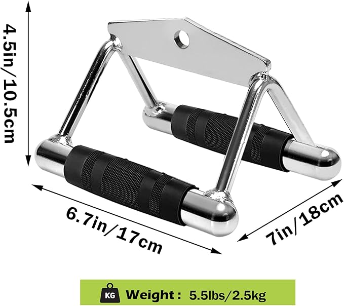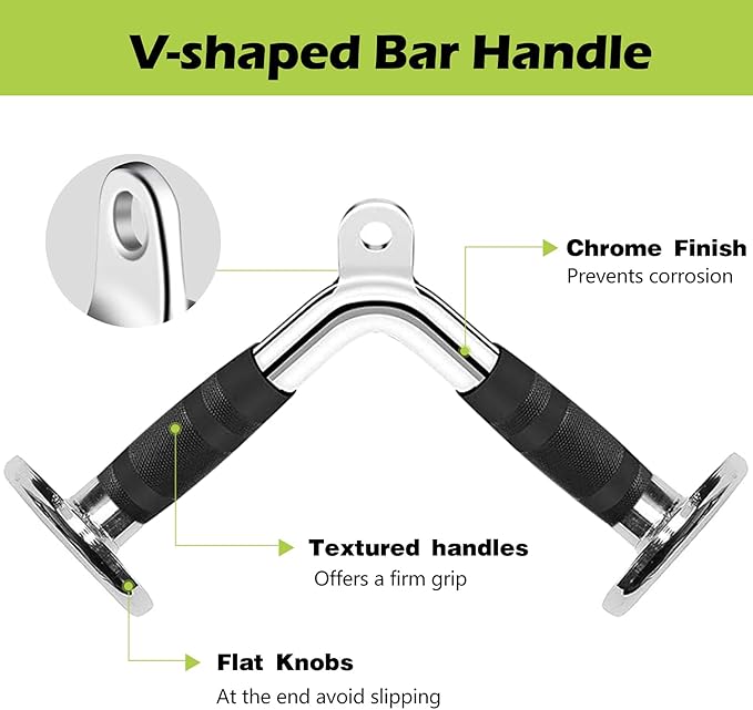 - V Shaped Bar (Double D Handle) & V Handle: Constructed of high-quality Iron with polished plating finish to prevent rust. Double Row Handle can support up to 880lbs (400 kg). 0.5 inch hole can fit easily for all cable system; provides a balanced force to both arms when attach it to any gym machine