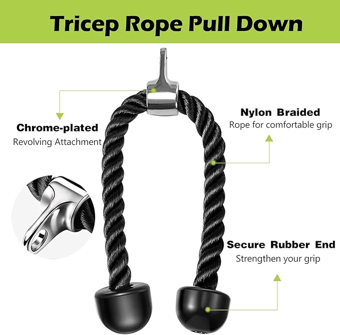 - Nylon Braided Tricep Rope: Made of heavy-duty black nylon braided rope with solid rubber ends, Length of 25.6in, it also features a hard chrome swivel that allows flexible movements for your triceps pull-downs workout