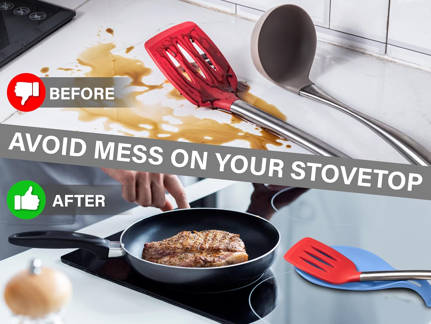 - ENJOY A MESS-FREE COUNTERTOP AND STOVETOP – Eliminate clutter with our Dual utensil rest for kitchen counter set. The set includes 2 flexible LARGE RESTS that hold 2 “XL” utensils at a time. ELEGANT SKY BLUE COLOR – neutral to accommodate most kitchen styles.