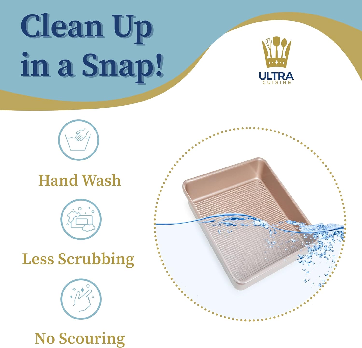 - EASY TO CLEAN: Spend less time scrubbing and more time making memories with friends and family! Made for easy cleanup, hand wash our square baking pan easily without deep scrubbing or scouring. Bake cakes and brownies or roast vegetables with Ultra Cuisine’s classic square cake pan and clean up in a snap - use silicone baking mats or parchment paper sheets to make cleanup even easier.
