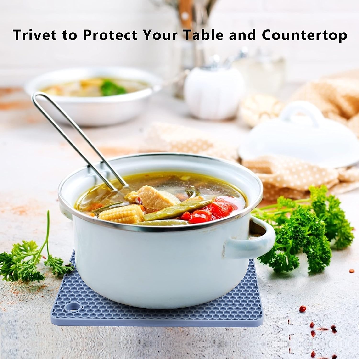 - 💝〘 FOOD-GRAGE SILICONE TRIVET MAT〙- The blue square silicone heat resistant mat are soft, light weight, durable, are perfect for protecting table. The blue color is neutral color, the mat is enough to go with most of the other things in the kitchen.