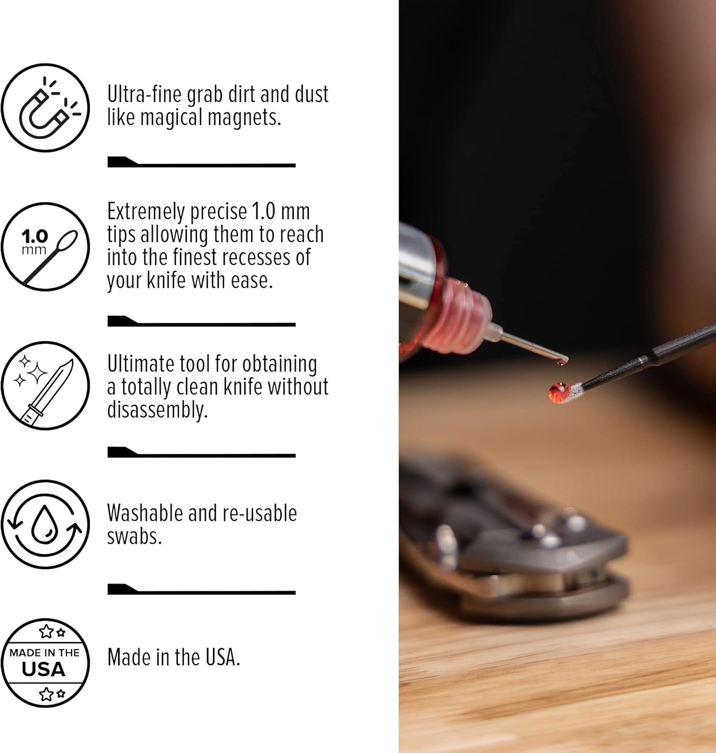 - 🔪 MADE FOR KNIVES: Cleaning swabs are tough on residue and ideal for a quick, thorough clean-up of hard-to-reach areas. Pocket knives are unique in that they are exposed to tons of harmful dirts, salts, and abrasive particles daily. A fine swab tip is perfect for reaching delicate areas, and they leave no fiber residue.