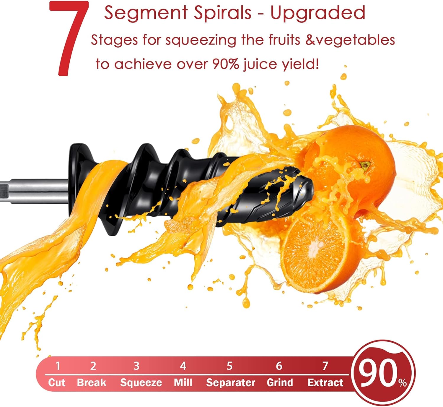- Less Oxidation, More Nutrition: The upgraded spiral system - 7 segment spirals open up each cell for maximum juice yield.No need to add water like other juicer.No no need to filter the pomace manually. From now on, enjoy the pleasure of pure juice. The juice retains its original taste and flavor. Enjoy the pleasure of less pulp, enjoy a more healthy life.