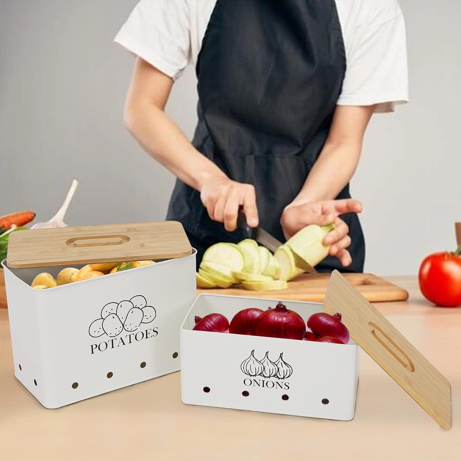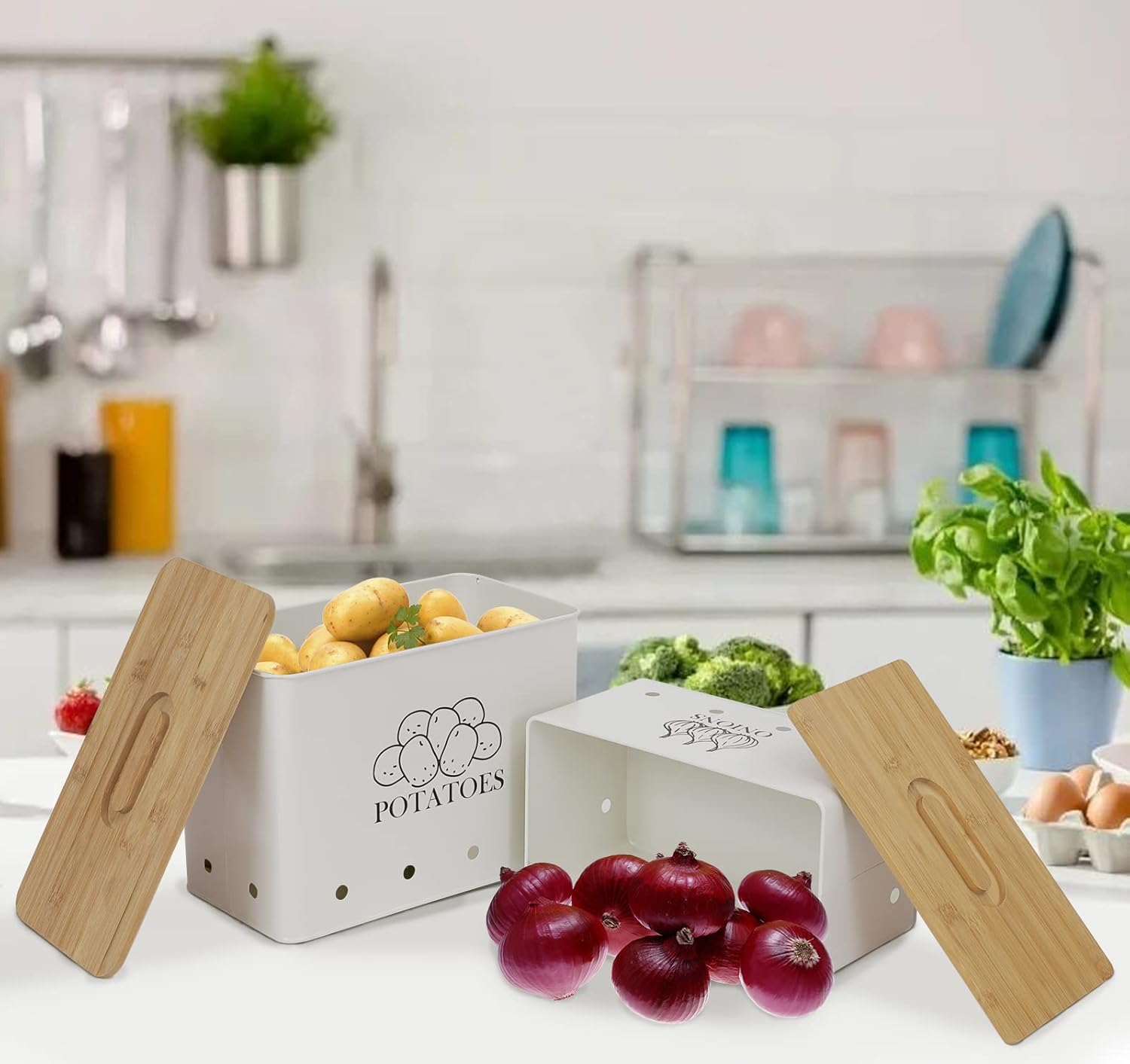 Potato Onion Storage Box, Food Container Sets, Storage Canisters for Vegeatables, Set of 2 Jars Pots Containers, Potato & Onion Bin with Aerating Tin Storage Holes & Bamboo Lid-White