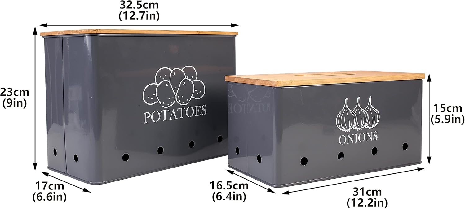 Potato Onion Storage Box, Food Container Sets, Storage Canisters for Vegeatables, Set of 2 Jars Pots Containers, Potato & Onion Bin with Aerating Tin Storage Holes & Bamboo Lid-Gray