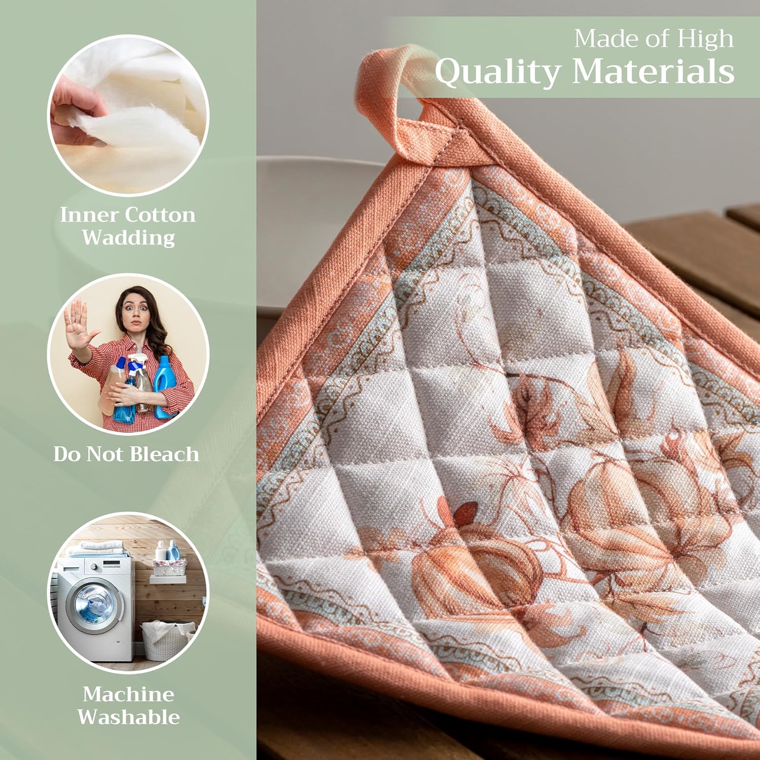 Maison d' Hermine Pot Holders Set 100% Cotton Heat Resistant Potholders 8" x 8" Hot Pads with Loop BBQ, Cooking, Baking, Grilling, Kitchen, Handling Hot Pans (Pack of 2, Giving Thanks)