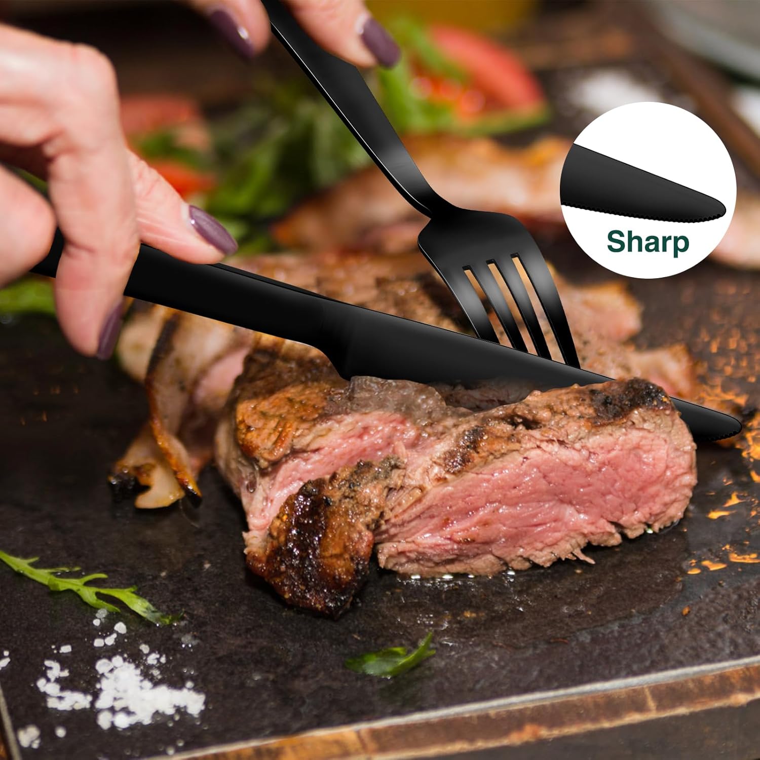 - BLACK FLATWARE SET FOR 8: 40-piece set of stainless steel flatware for everyday use or casual & special occasion. This silverware set includes 8 dinner spoons, 8 dinner forks, 8 dinner knives, 8 salad dessert forks, 8 teaspoons. It would be a nice set of tableware to serves guests and family members.