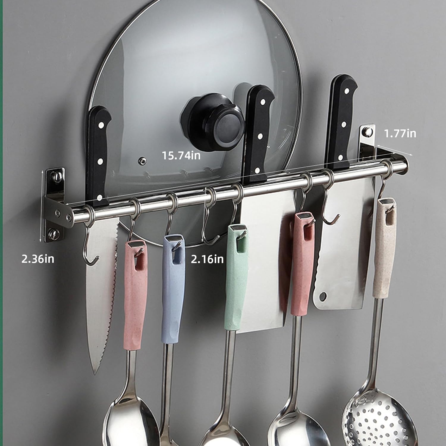 ASkinds Utensil Hanging Rack Stainless Steel Rail Hanger Rod Wall Mounted Pot Pan Lid Holder Cookware Storage Organizer with Sliding Hooks for Kitchen Bathroom
