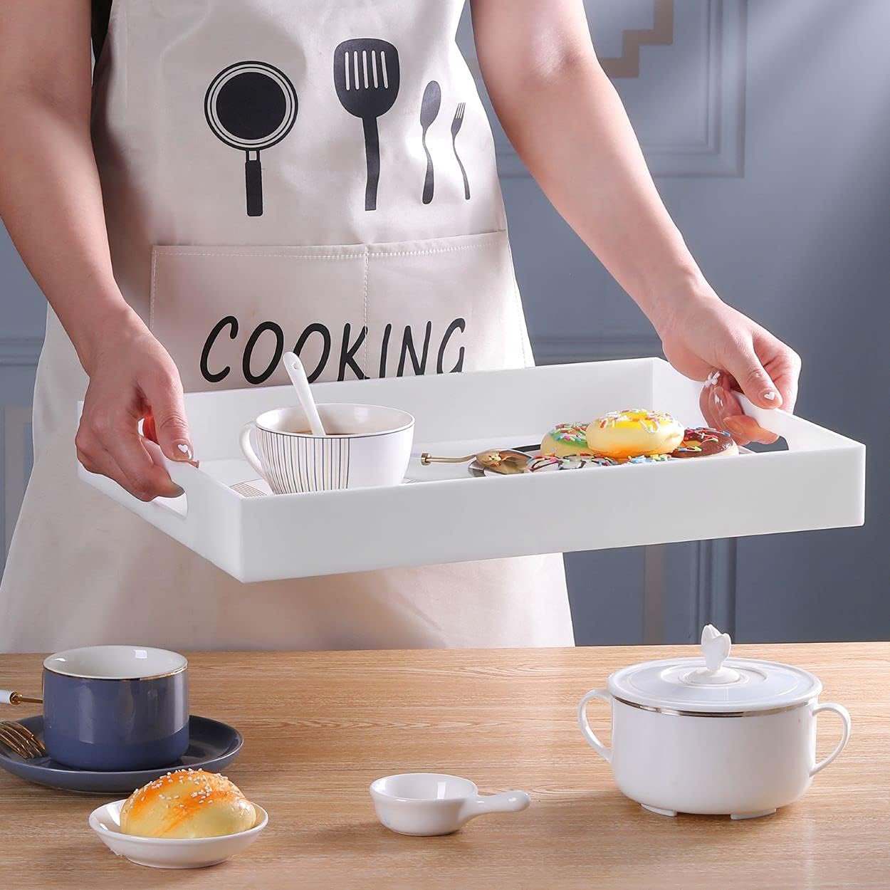 - Multifunctional- Serving tray for serving breakfast, appetizers, coffee, drinks, desserts, snacks, fruit, cheese, food; Decorative organizer tray for cosmetics, jewelry, remote, glasses, ornaments, magazines. Tray can be put on an ottoman, bed, coffee table and couch. It’s elegant to be put on any tabletop or countertop as an accessory.