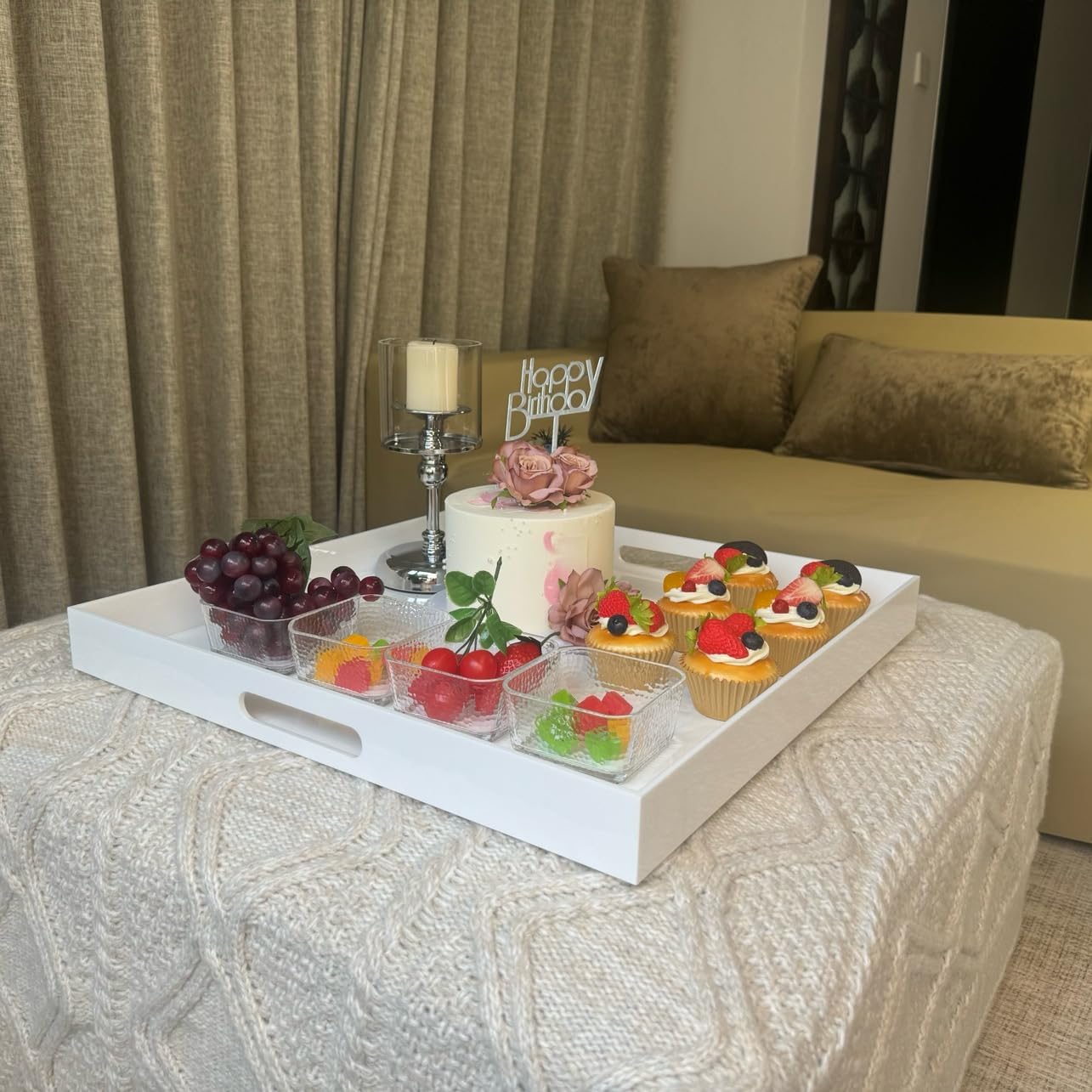 White Modern Acrylic Ottoman Tray with Cutout Handles 20x20 Inch Over-Sized Serving Tray Organizer Rubber Boot Tray Decorative for Living Room Bedroom,Bathroom and Entryway Kitchen