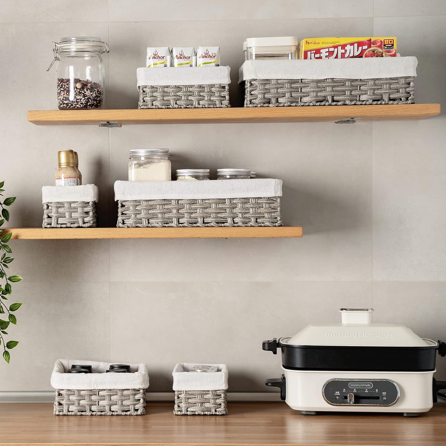 - Waterproof Material & Removable Liner: Small wicker basket made of durable plastic, which is water-resistant, durable and easier to clean. Wicker baskets for organizing featured with Liner, which is removable and washable, convenient for daily use. (Please note: the liners are packed inside, please take out the 2 smaller baskets and put liners into suitable wicker baskets.)