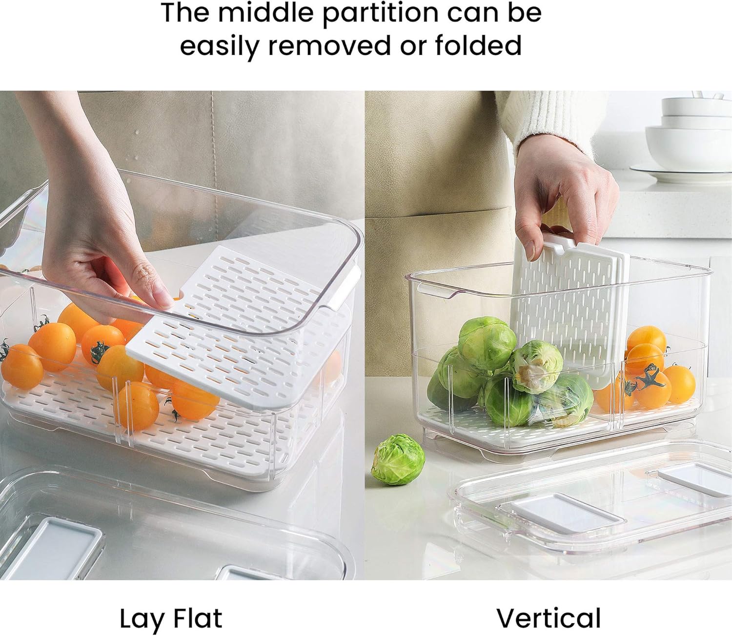 - 【Classified Storage Design】Bottom filter tray helps keep moisture away from produce to reduce spoilage. vacane fresh produce saver come with adjustable foldable partitions for classified storage to prevent the food from squeezing and rotting. The bottom of the container has small opening that could be opened to empty out water and also can be used as colander to clean produce.