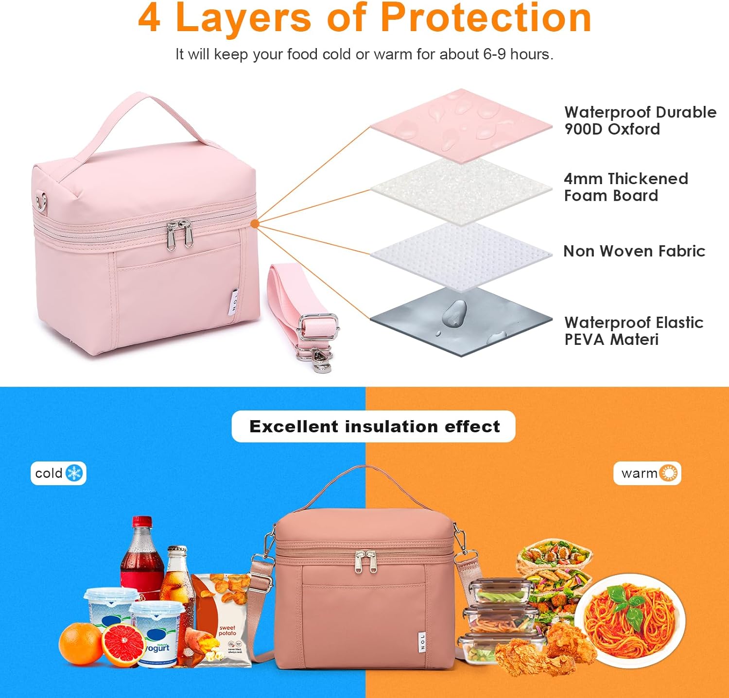 - Insulation & Freezing: the bag inside used the insulated 4mm thick PEVA lining,which provide great insulation to keep the food warm or fresh up to 5 hours. Very convenient to take food for work, office, picnic, camping and other activities.