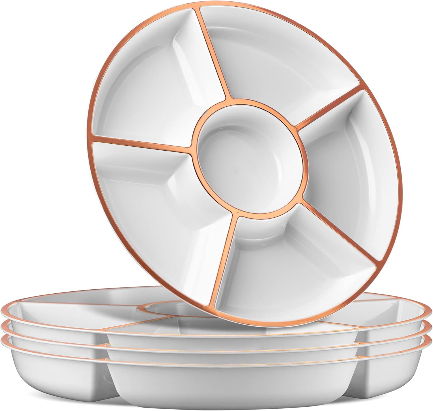 Plasticpro 6 Sectional Round Plastic Serving Tray/Platter (2, White & Rose Gold)