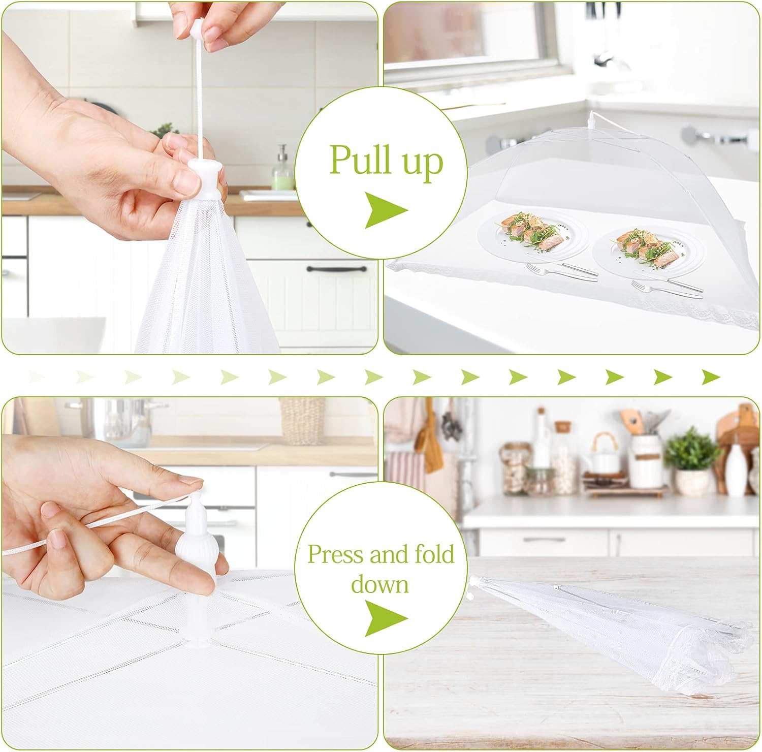 - Easy to Use and Clean: The pop-up design allows the food screens to be locked by a simpler pull action. If you try to open it, grasp the lid with one hand while the cord is pulled to the top to lock; If you try to fold it, simply press the top button. If necessary, clean the net with soap and water to remove stains and air dry