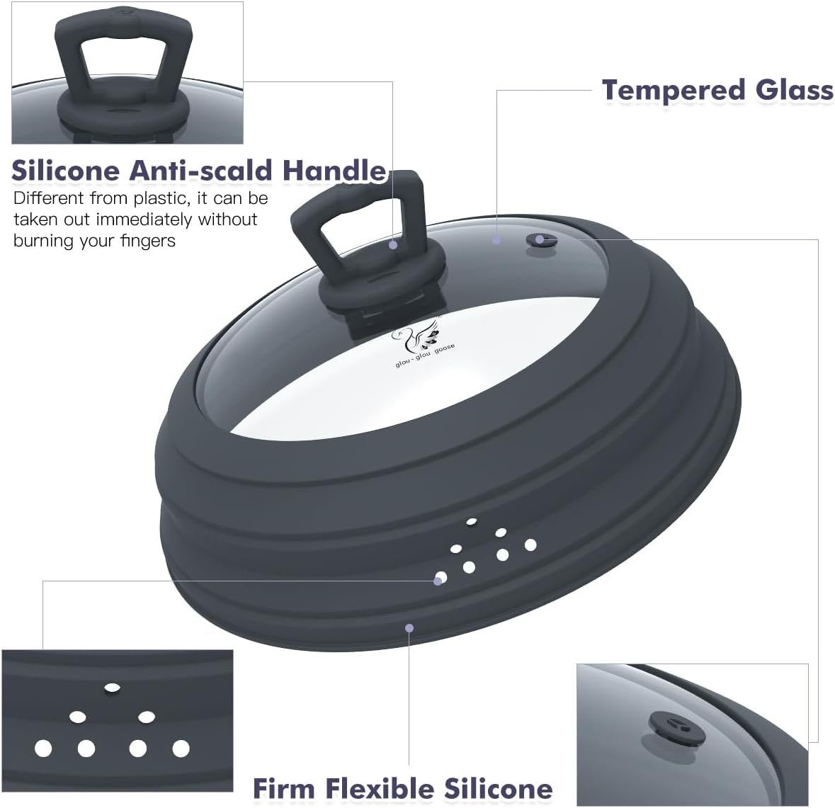 - 【UNIQUE HANDLE】: Splatter guard lid with easy grip silicone round handle, 100% Tempered glass, 100% food grade, BPA Free and dishwasher safe, It can also be used as a common pot cover, Convenient multi-purpose pot cover.