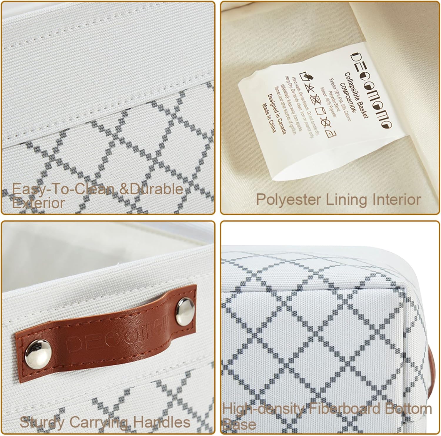 - Durable Design: DECOMOMO's baskets feature a sturdy metal frame, extra thick EVA exterior, polyester interior, 2.5mm MDF fiberboard bottom, and faux leather handles capable of holding up to 15 lbs.