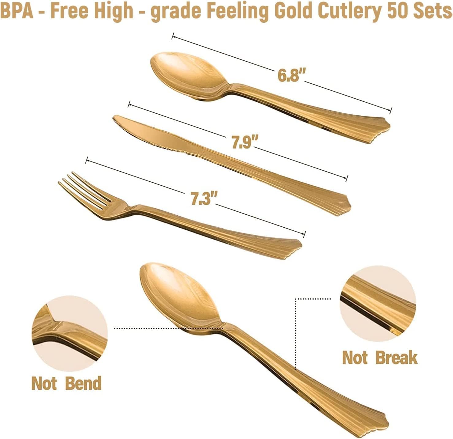 - ✔「Sever for 50 Guests」: This blue paper plates set comes with including 9" dinner paper plates *50, 7" paper dessert plates *50, 9oz paper cups *50 and luncheon napkins (3-ply and measuring 6.5" x 6.5") *50, 50 sets of heavy duty gold plastic cutlery (50 forks, 50 spoons, 50 knives)