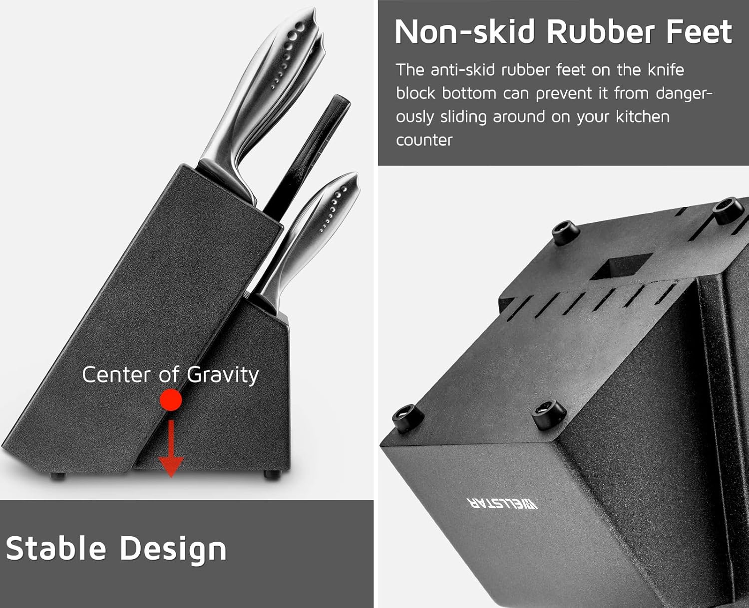- 【ANTI-SKID RUBBER FEET】Four anti-slip rubber feet are securely amounted onto the bottom of the block which prevents it from dangerously sliding around on your kitchen counter.