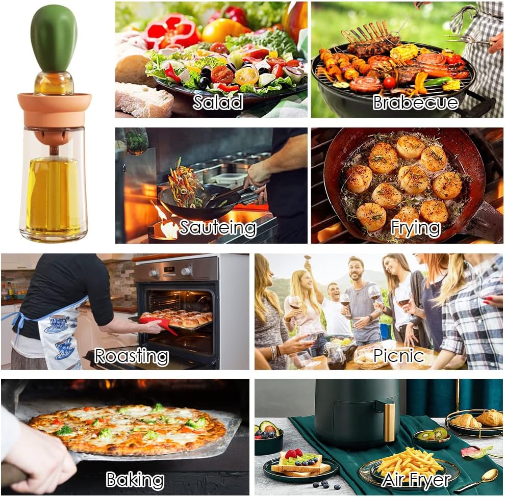 - Special Unique Design - All-New 2-in-1 silicone oil basting brush with oil dispenser makes spray oil easy and quantitative. The oil brush spot is composed of silicone pipet head, AS transparent oil storage space with measurement scales, T shape silicone brush, PP filter funnel, PE straw and glass bottle. Just squeeze the silicone pipet head you can basting oil easily