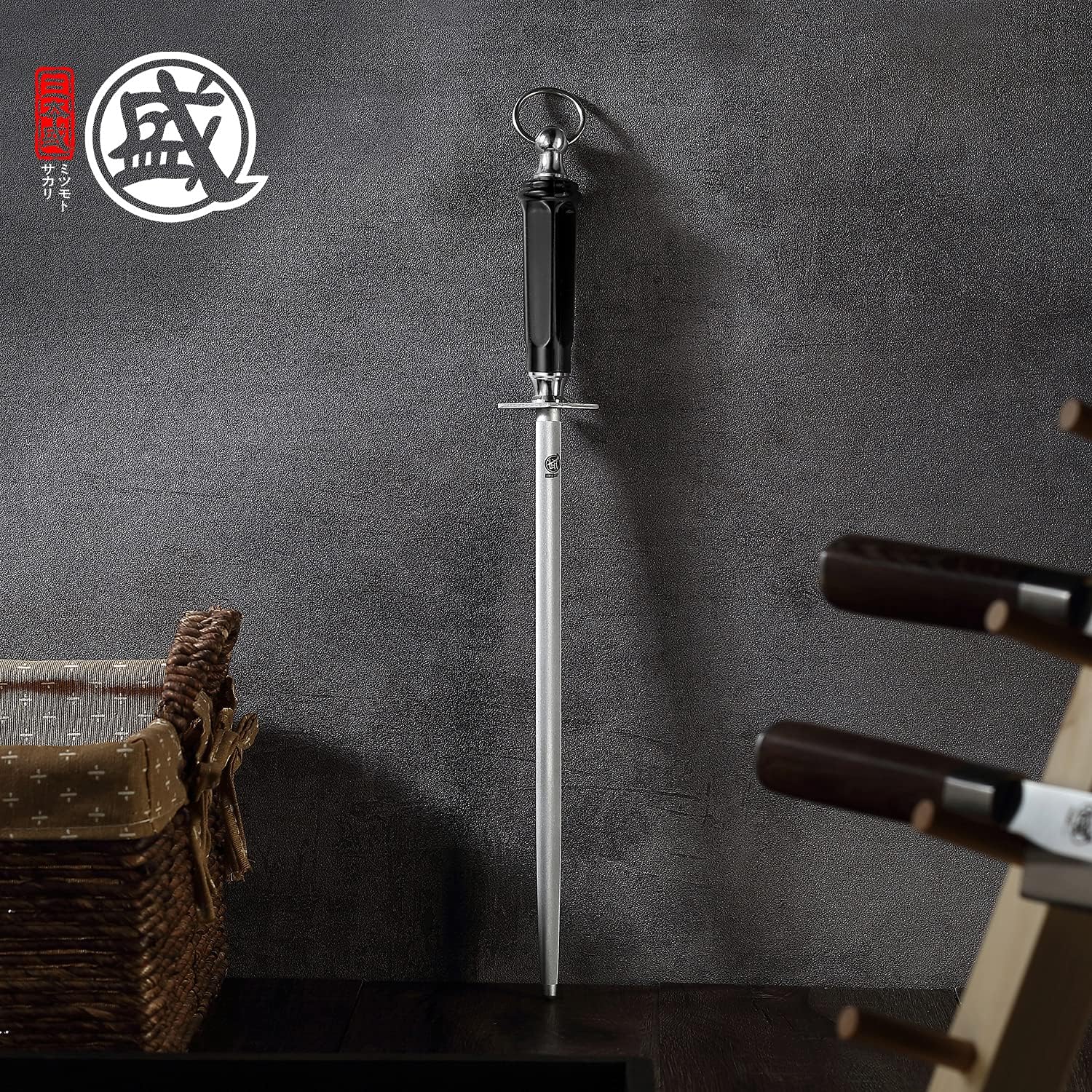 MITSUMOTO SAKARI 12 inch Japanese Honing Steel - Round Diamond Knife Sharpening Rod, Professional High Carbon Sharpener with ABS Handle & Powerful Magnet