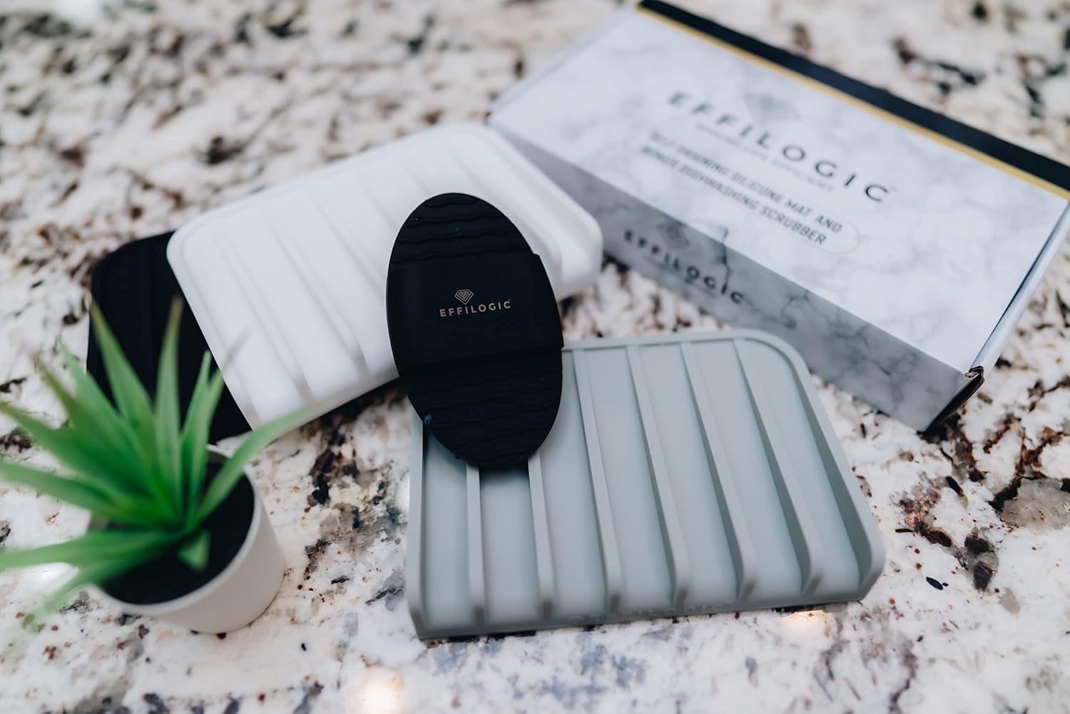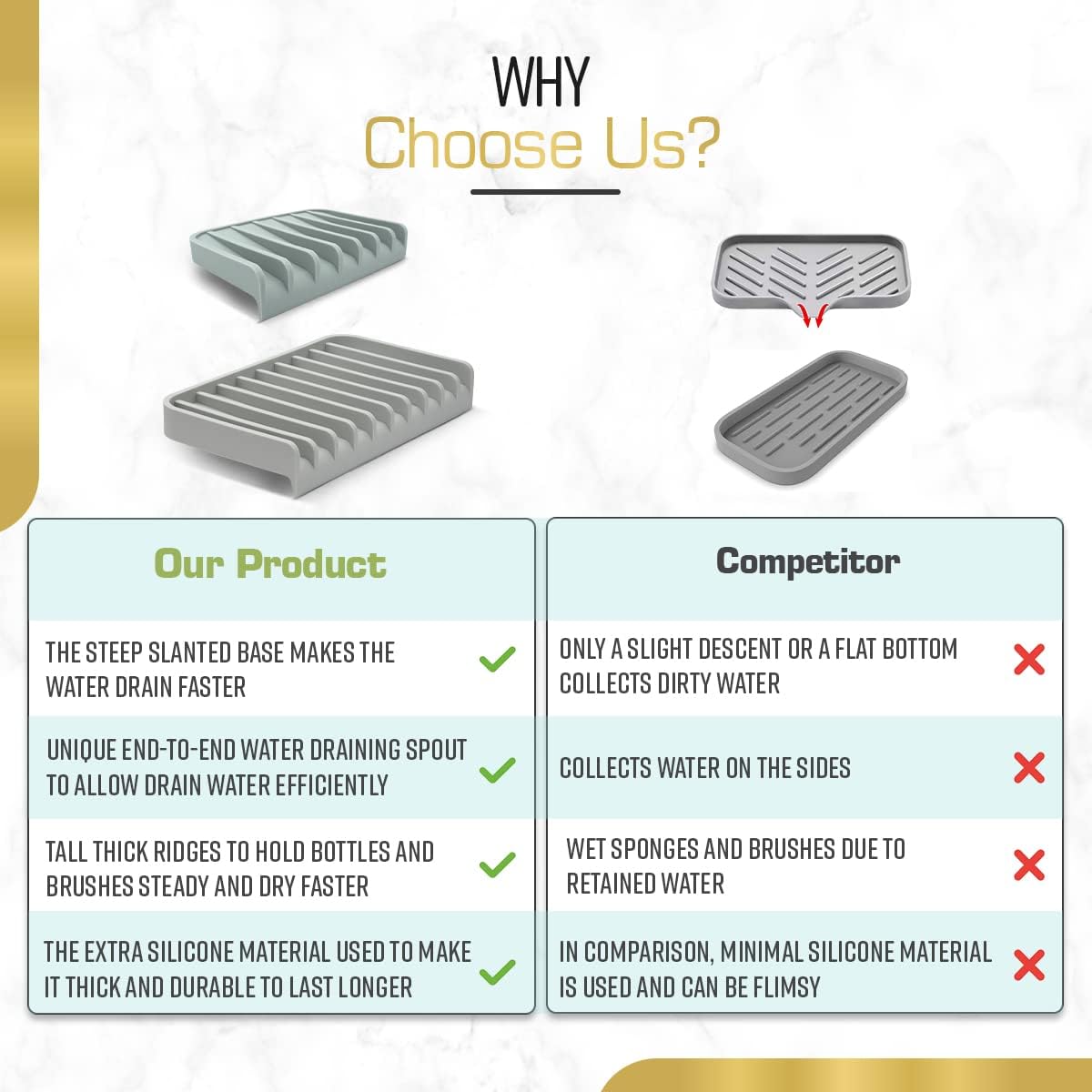 - ✅ UNIQUE WATER DRAINING DESIGN: Effilogic kitchen sink sponge holder is unique because It has a patent design with a lip and slanted floor. This draining design allows water to drain from utensils, sponges and any kitchen sink accessories automatically without collecting water. Effilogic mat protects your kitchen counter top. Great alternative for water collecting Kitchen Sink Caddy! ❗Does NOT include brush or accessories.❗