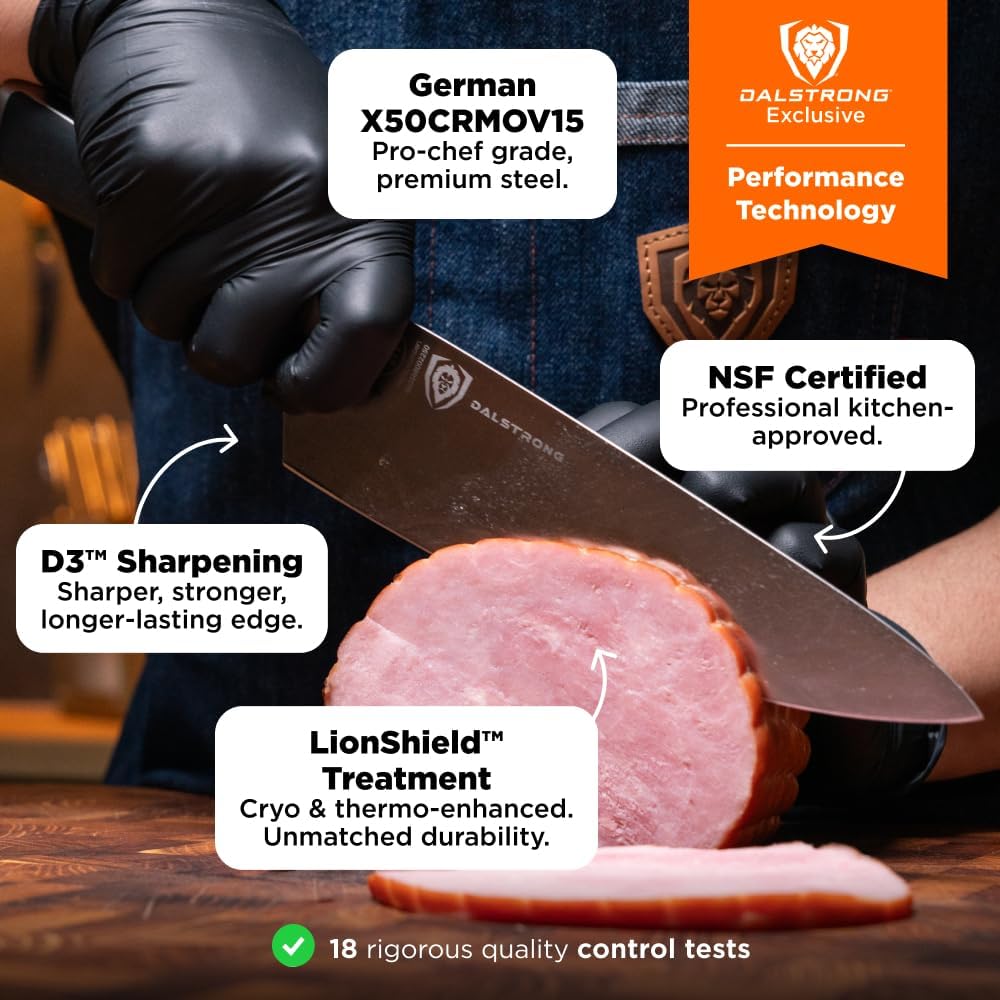 - Elegant Design and Functionality: The midnight black POM handle - highly impervious to water and heat-ensures comfort and durability. For an added touch of sophistication, the Dalstrong Lion Head pin on each handle is a reminder of the quality you can trust. With the custom-fit sheath, you can store it safely in your cupboard or take it on the go. This combination of materials and design provides both functionality and elegance, making it an essential addition to your kitchen.