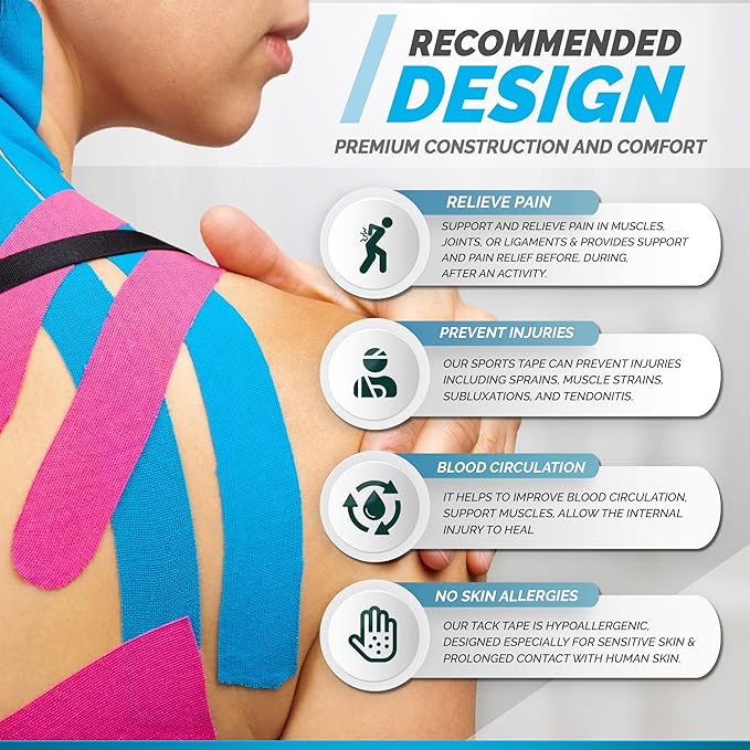 - Blood Circulation & Healing - Our sports tape athletic kinesiology helps to improve blood circulation, support muscles, allow the internal injury to heal, and help prevent further muscle injury while still allowing motion.