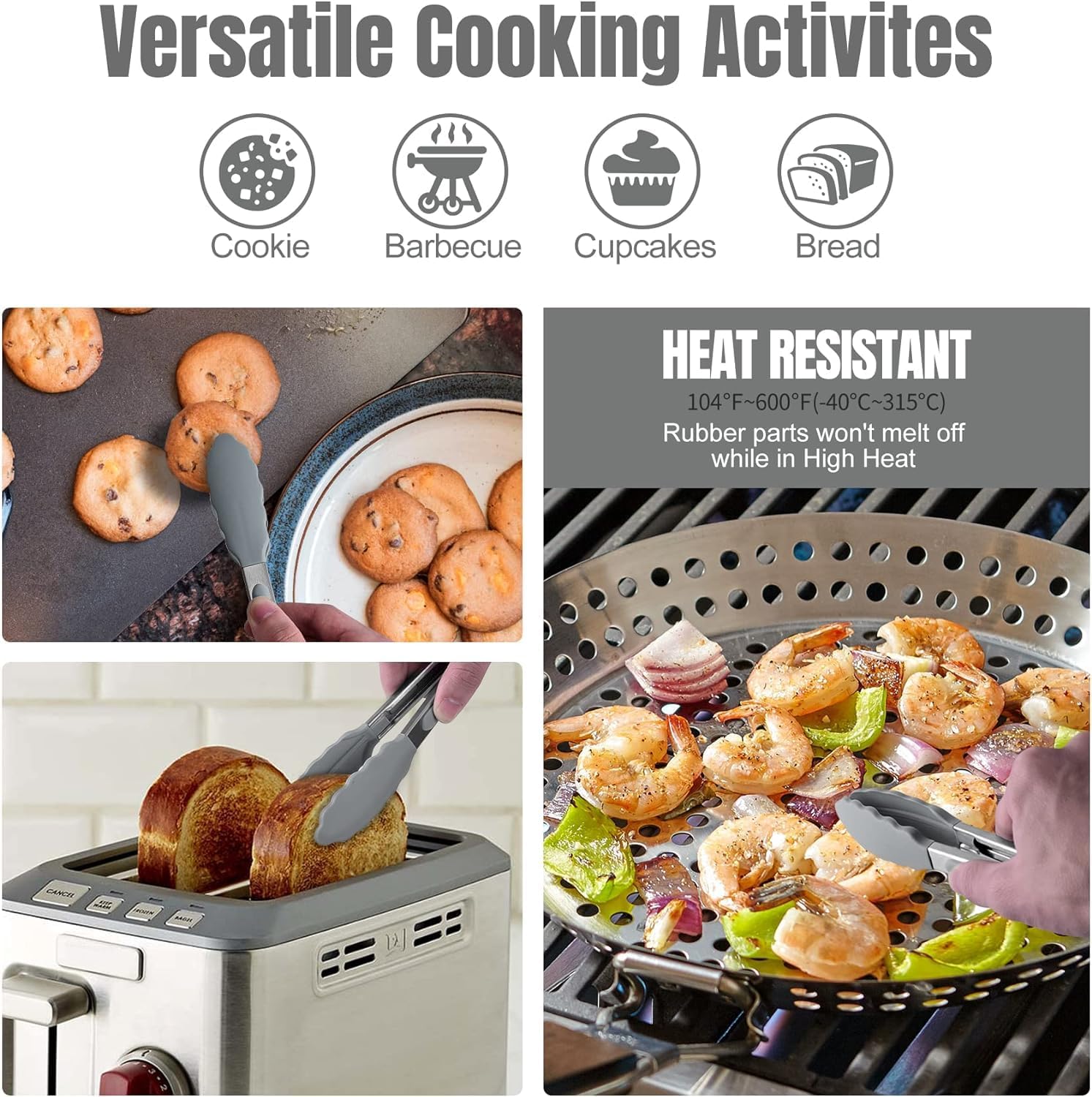 - EASY TO USE: The cooking tongs' handle is cushioned with silicon, good for thumb rest and ensures good grip and control. The Food Grade silicon tongs tip is heat resistance 600°F and less prone to scratch the pan. Easy to rinse, dishwasher safe.