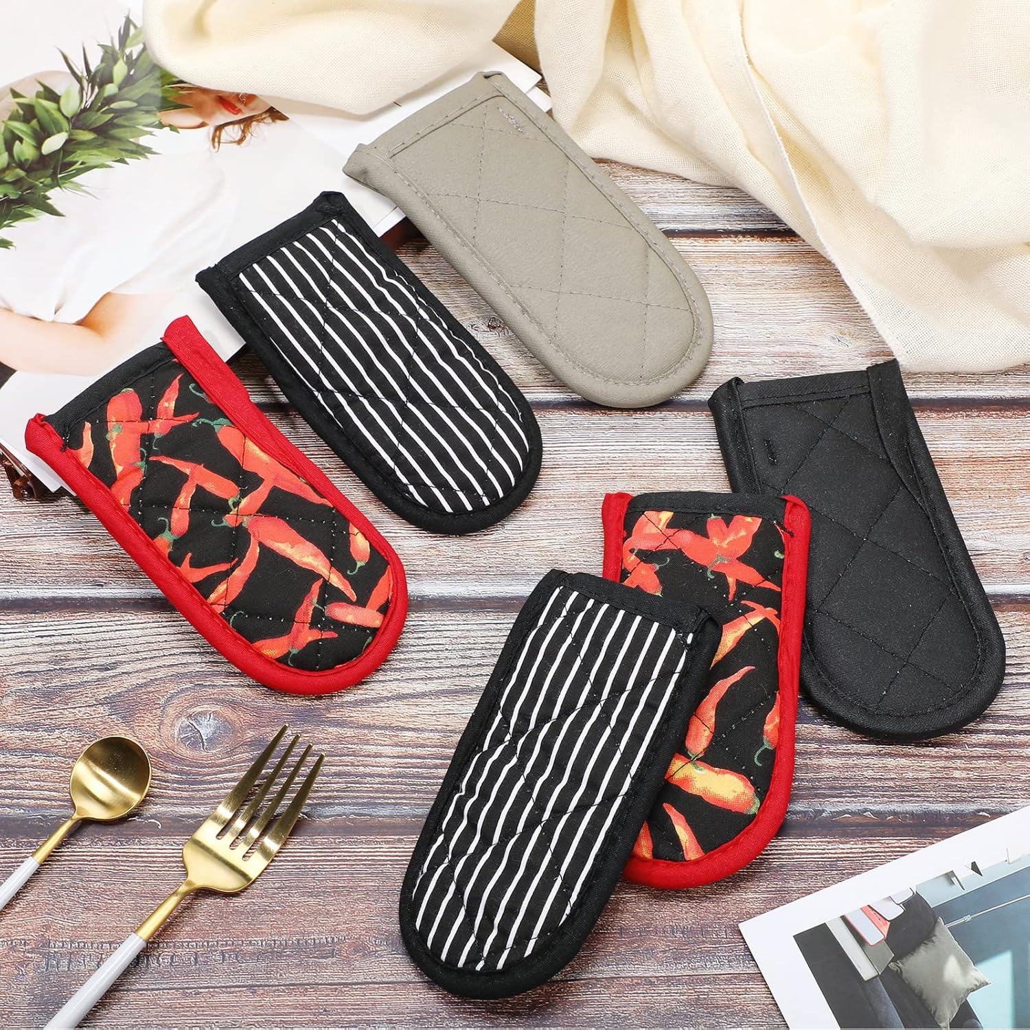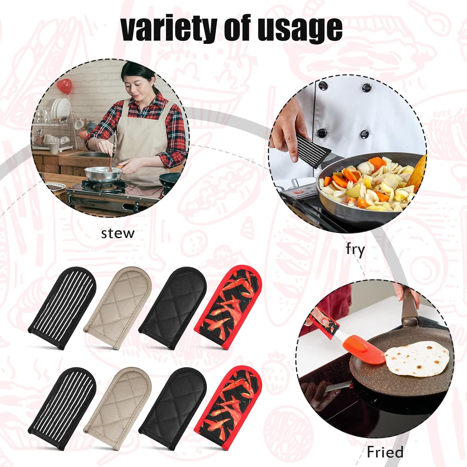 - Sufficient styles set: 4 styles of these non-slip pot sleeve grips for you to choose, include solid black color, black and white buffalo plaid, red base color with white stripe, black base with red pepper design, you can choose the styles you want to add touch to the kitchen cookware