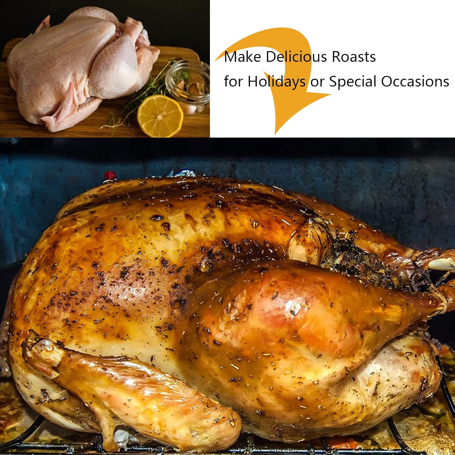 - Durable Racks: The roaster features a removable U-shaped rack that keeps meats off the bottom of the pan, and a convenient flated rack which raises meats up to allow fats to drip away.