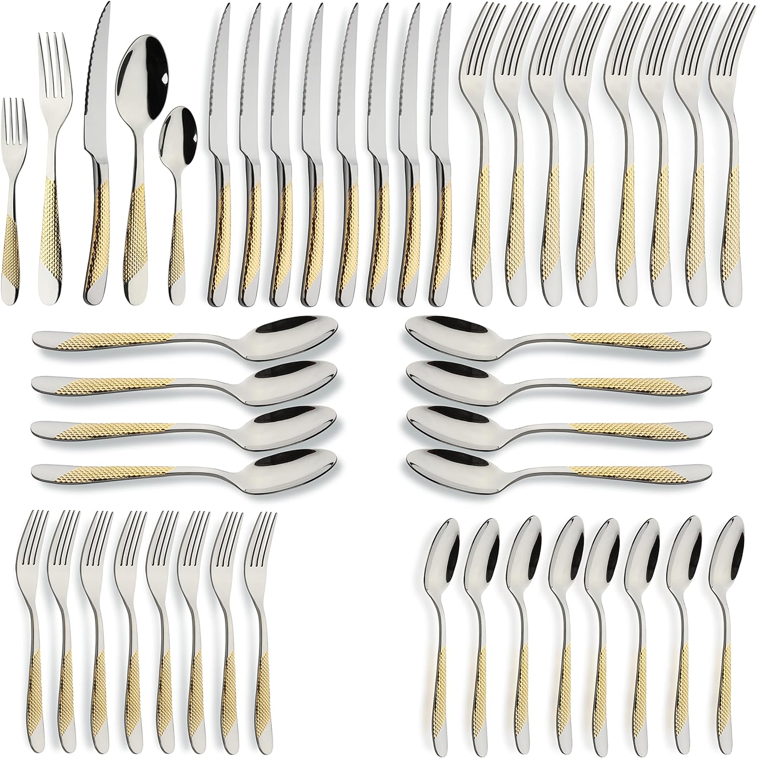 - 【Gold Silverware Set】This 40-piece flatware set includes 8 salad forks, 8 dinner forks, 8 dinner knives, 8 dinner spoons, 8 teaspoons.It can be used for daily use,service for 8 people.