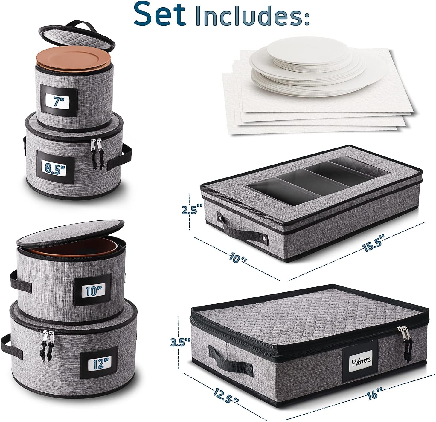 - Dish Organizer Set of 6: This set includes 4 plate storage boxes for 7”, 8.5”, 10” & 12” plates; 1 silverware case 10” x 15.5” x 2.5”; and 1 platter storage case 16” x 12.5” x 3.5”.