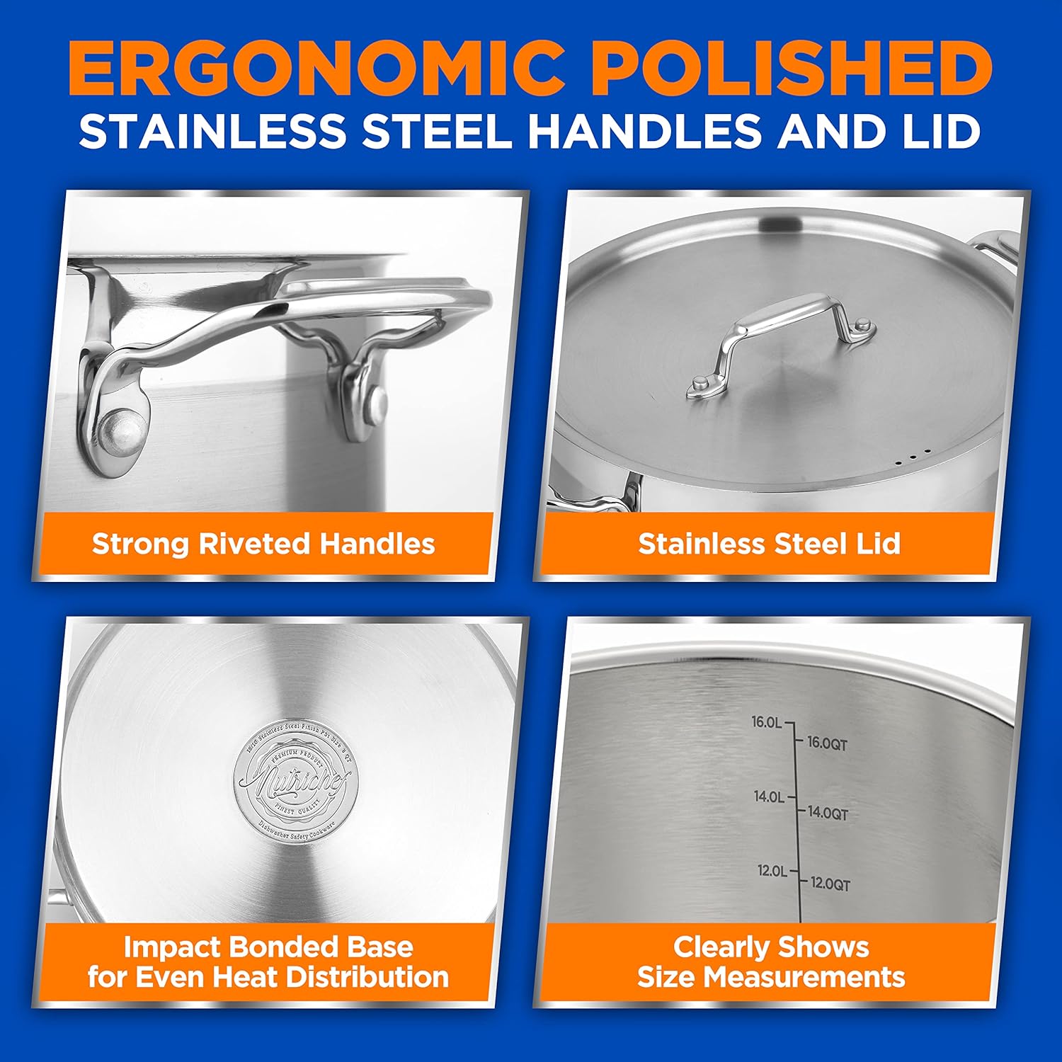 - 16 QUARTS:The NutriChef Stainless Steel Large Cooking Pot features 16-quart capacity weighing 6.55 lbs w/ lid which is the perfect size for boiling eggs, simmering stocks & soups or making sauces for a large crowd.Great for commercial & home cooking