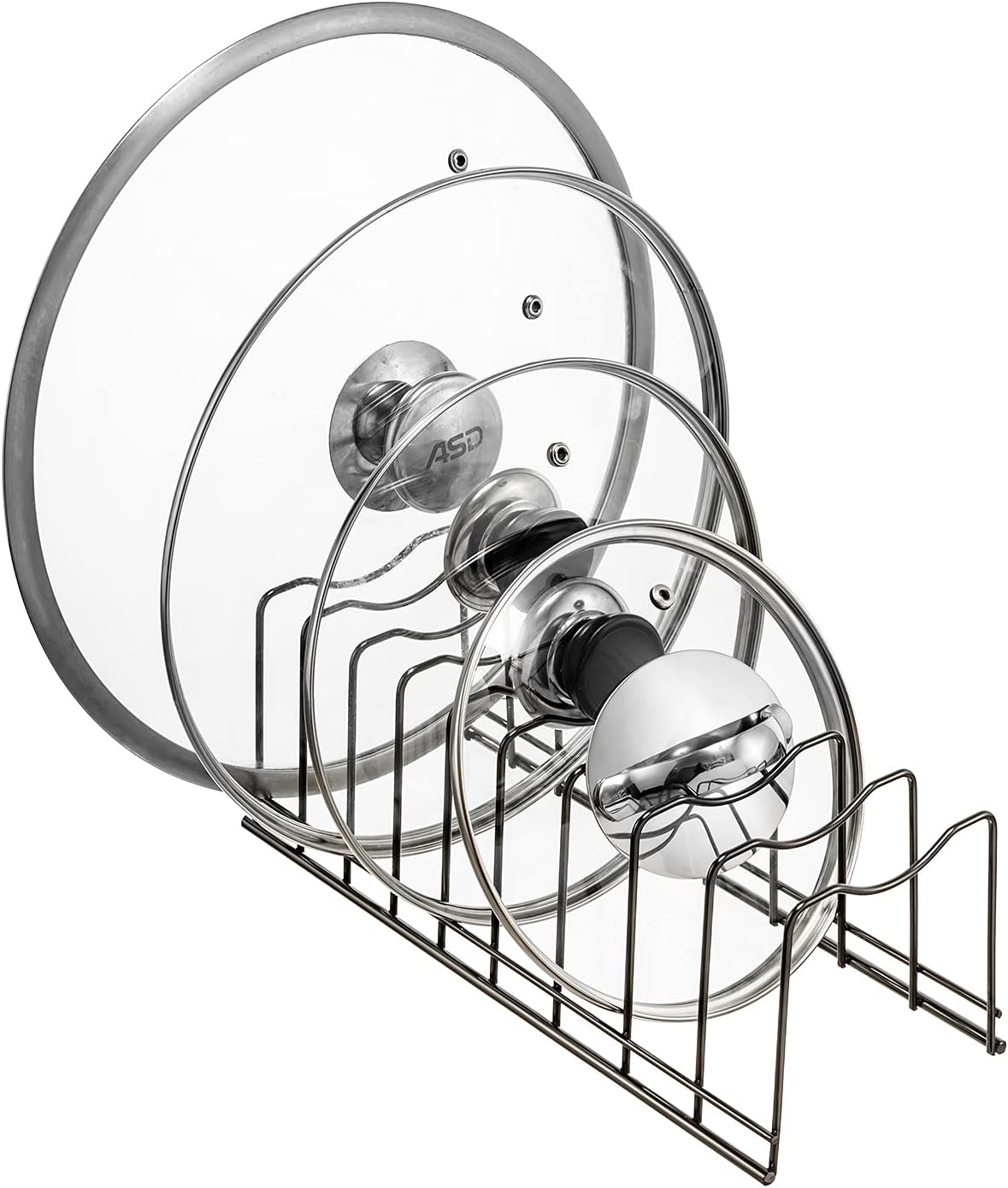 - Pack of 2 pot lids holder.DIMENSIONS: Overall Dimensions -12-4/5"W x 4-1/2"H x 4-1/3"D; Each compartments width: there are 4 Slots x 1.57" width and 5 Slots x 1.18" width to fit your different needs.