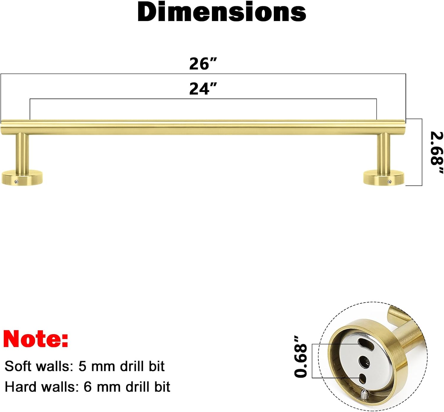 - DIMENSIONS & USE: Overall length is 26" (670mm). The length of hanging space is 24" (605mm). 22-Lbs (10kgs) max weight capacity. You can mount this towel bar to either side of your cabinet or closet door for storing at-use hand and dish towels. It can also be used with S hooks, hanging bath balls, hairdryers, teacups, spoons, clips, etc.