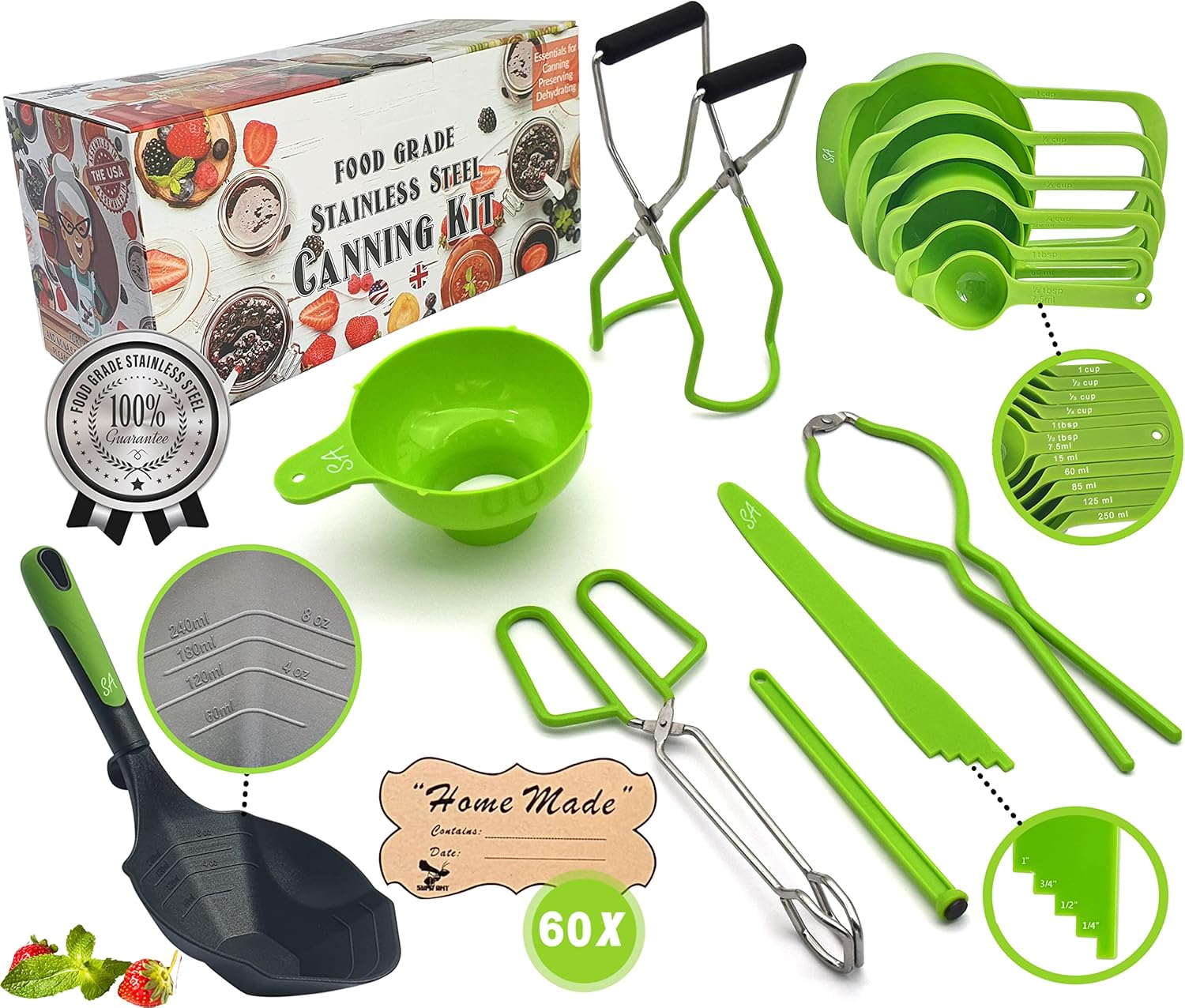 - Canning supplies starter kit + add ons to speed up the process (in green flourescent color) - From homemade jam, pickles, sauces, salsas and stews to water bath canning, dehydration and other purposes with sturdy canning utensils and equipment for your piece of mind, all in a pleasant color to liven up the kitchen and make them more visible when you are looking for them and a box so you can store the set away until next time.
