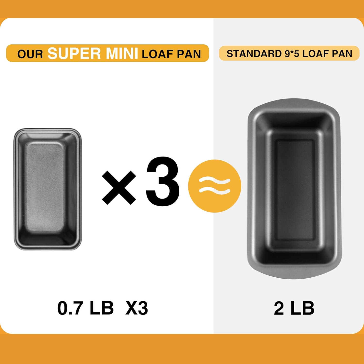 - ALL-INCLUSIVE SET - Our super mini bread pan comes with 3 personal external sizes (6*3.3*2in) and Internal sizes (5.75*3*2in) nonstick bread pans to make multiple pieces of bread at once. In addition, this small loaf pan set is compatible for use with pressure cookers, ovens, and air fryers
