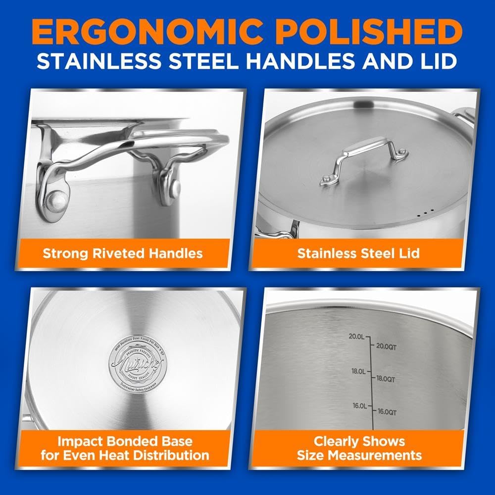 Stainless Steel Cookware Stockpot - 20 Quart, Heavy Duty Induction Pot, Soup Pot With Stainless Steel, Lid, Induction, Ceramic, Glass and Halogen Cooktops Compatible - NCSPT20Q