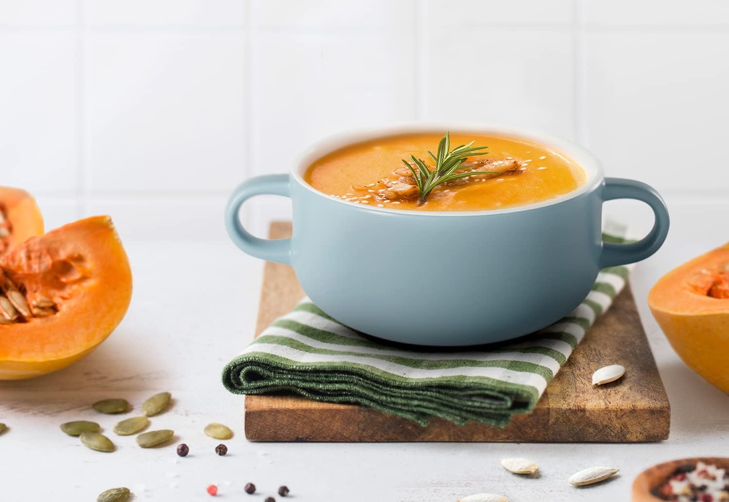 KooK Soup Crocks, Ceramic Bowls, Broil, Oven, Microwave and Dishwasher Safe, with Handles, For Casserole, Pasta, Cereal, 18 oz, Set of 4 (Pale Blue)